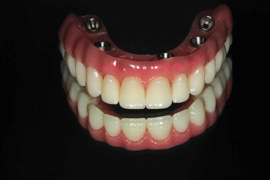 Postsurgical biologic complications following All-on-4–style dental implant surgery are rare.1-12 The most common postsurgical complication following this surgery noted in the dental literature is fracture of the provisional restoration, with rates from 4.17% to 41%.46-48 Fractures of provisional All-on-4–style restorations during healing are concerning, because they eliminate cross-arch stabilization and disrupt stress distribution patterns. Furthermore, fractures of these prostheses are unsettling to patients because they impair masticatory function and marginalize esthetics. The most common causes of fractured All-on-4–style provisional restorations are prostheses of inadequate thickness due to under-reduced bone, processing errors, or improper occlusal adjustment.46 In some cases, however, fractures may occur because acrylic and polymethyl methacrylate materials are inadequate for extended periods of heavy occlusal use.