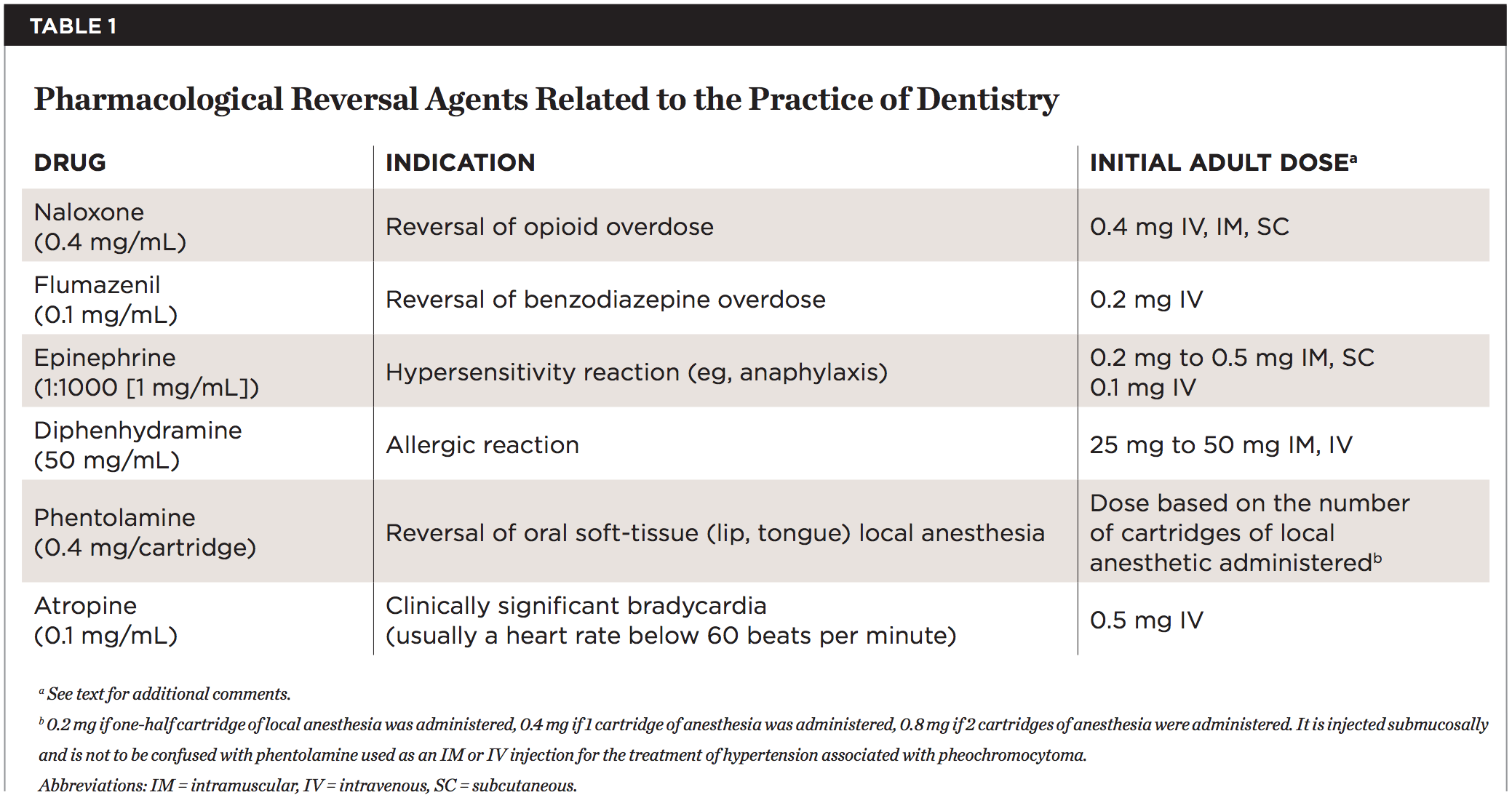 This article will review six specific pharmacological reversal agents as they relate to the practice of dentistry: naloxone, flumazenil, epinephrine, diphenhydramine, phentolamine, and atropine (Table 1). In general, these antagonists were developed for administration as reversal agents in emergency situations in which a patient had an untoward effect, typically caused by too much medication. Some newer agents being developed are now being considered for more routine use to reverse the effects of an agonist medication once the dental procedure is complete and the effects of the agonist medication are no longer required.