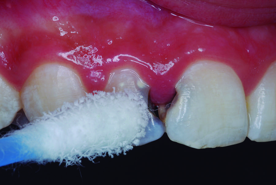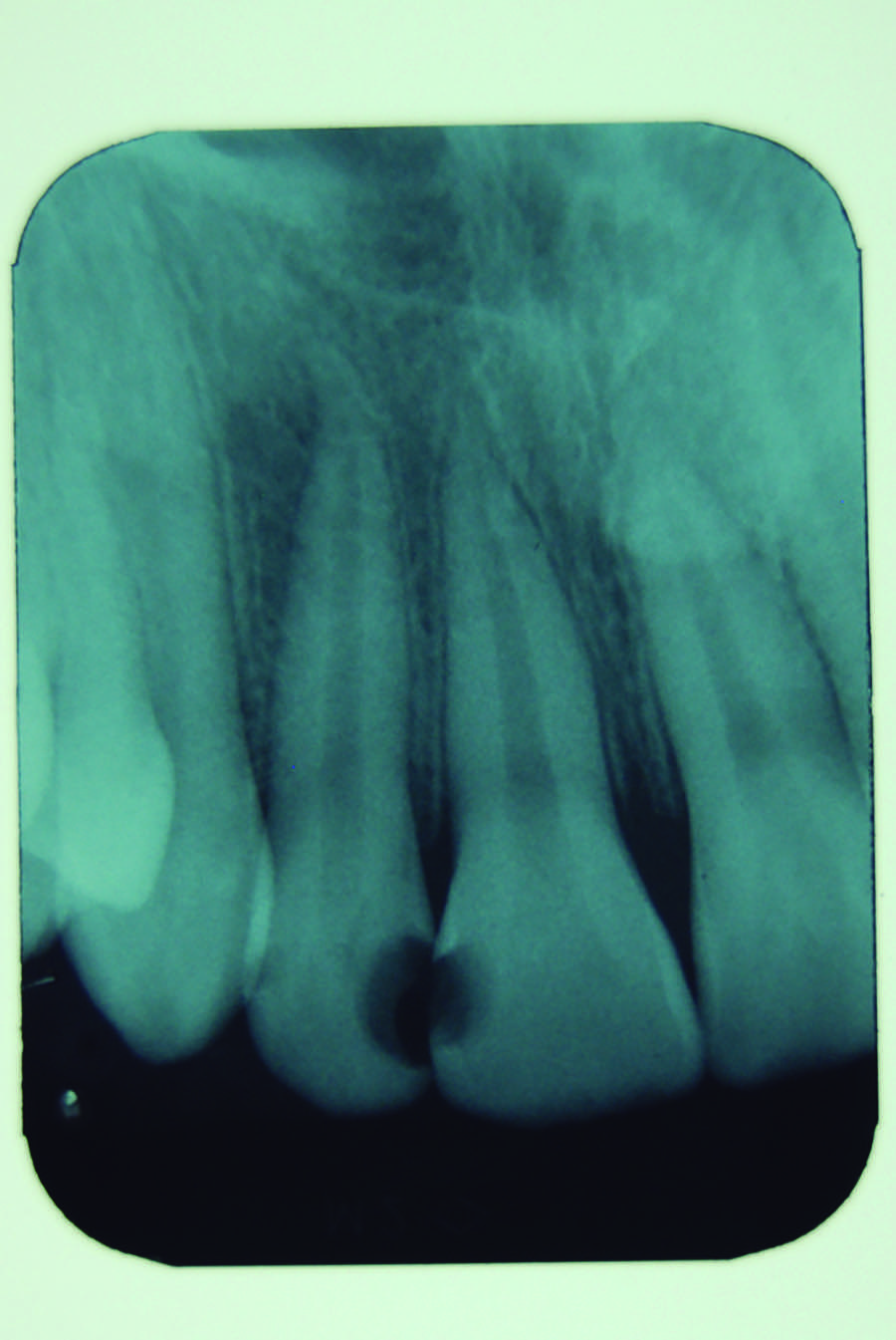 A 12-year-old male presented with extensive carious lesions observed on teeth Nos. 7 through 10, which were accompanied with gingivitis (Figure 1). The pulpal condition was verified through thermal sensitivity tests and vertical percussion, both being satisfactory (Figure 2). The proximity of the lesions with the pulp chamber and the absence of periapical lesions, especially in the right lateral incisor, were observed by the radiographic examination (Figure 3).