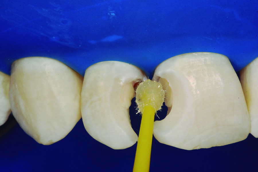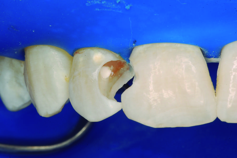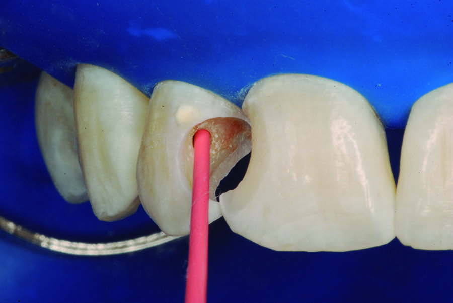 Once the maintenance of pulp vitality was verified, esthetic restorations of the teeth were performed. Initially, the teeth color shade was selected with the aid of a commonly used shade guide. After the isolation with a rubber dam, complete removal of the decayed dentin was performed in the teeth that received the stepwise excavation. The clinical verification of the presence of the mineralized barrier was performed in the maxillary lateral incisor with the aid of a disinfected gutta-percha cone, compatible with the diameter of the cavity. The authors recommend this procedure, because it allows the clinician to verify the formation of a mineralized barrier without compromising this critical area or causing a new exposure of the pulp tissue to the oral environment (Figure 11). After this, all teeth were treated with an indirect pulp capping technique. To obtain esthetics and functionality, beveling of both buccal and lingual surfaces was performed with No. 3118 diamond burs (Figure 12).