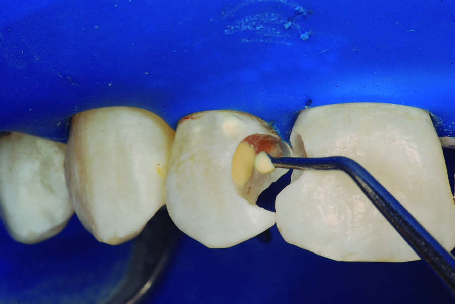 The more conservative approach, indicated in deep caries lesions with respect to minimal pulp exposure, is stepwise excavation. The goals of this tactic are to mechanically remove the infected (demineralized) dentin, reducing the amount of cariogenic microorganisms,2 and to seal the partially demineralized dentin by placement of calcium hydroxide paste over the remaining pulpal wall and to perform a provisional restoration with GIC (first intervention). The biological mechanism consists of the reduction of the cariogenic microorganisms’ action (bacteriostatic action) and stimulation of odontoblasts to form reparative and sclerotic dentin.14 After 45 to 90 days, the remaining carious dentin can be removed and the cavity preparation can be performed with a lower risk for pulpal exposure.15 In fact, this procedure has been shown to reduce pulp exposures by 98% when compared with the one-visit approach in which all carious lesions are removed; the literature supports this technique to avoid more complex restorative procedures.16-20