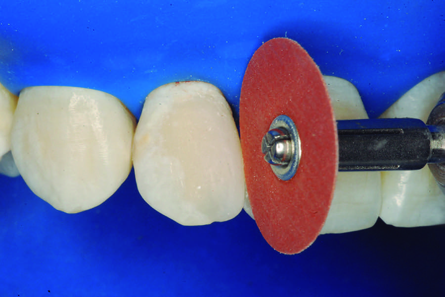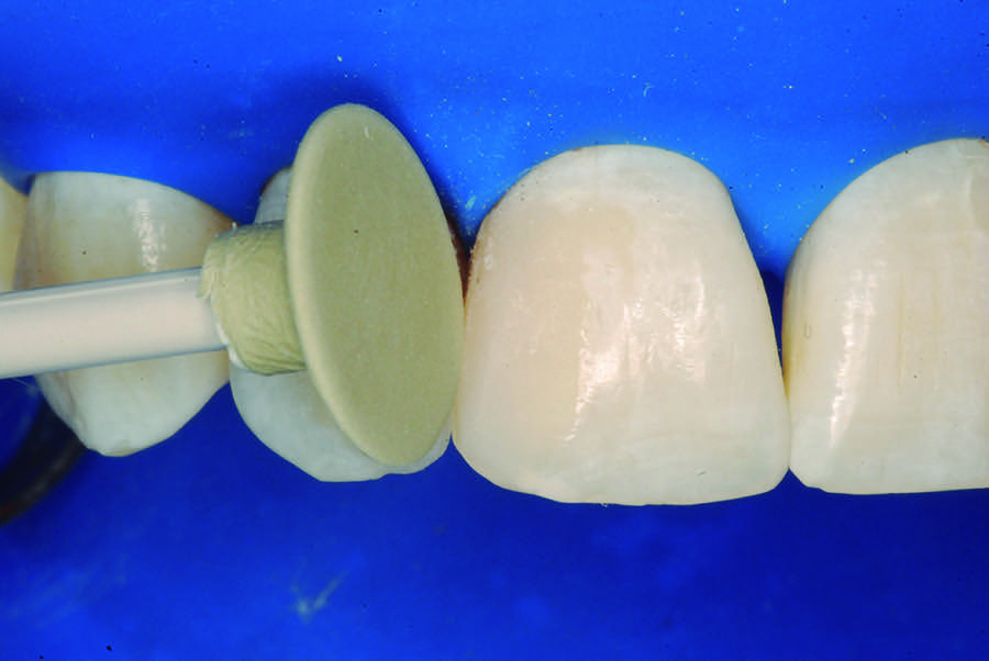 After 7 days, final finishing and polishing were performed using abrasive discs (Figure 16), multi-laminated burs, abrasive rubber points, and, finally, a felt disk with 40-μm diamond paste (Figure 17 and Figure 18). The results could be observed after 200 days (Figure 19), demonstrating the absence of a pathologic lesion in the apical region of the lateral incisor with an esthetic favorable condition, gingival health reestablishment, and pulp vitality maintenance.