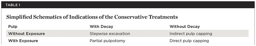 To make the maintenance of pulp vitality possible, different conservative treatments can be used, depending of the presence or absence of remaining deep caries lesions (Table 1).