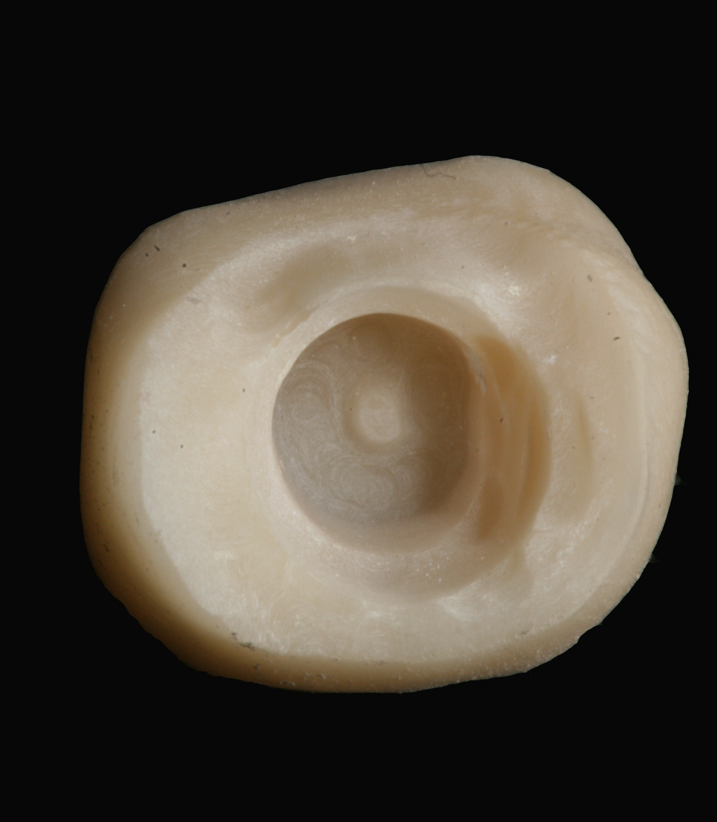 The altered, color-corrected abutment is then placed onto the implant fixture and torqued to the implant manufacturer’s recommendation. From an occlusal view, any gingival tissue that obstructs the margin of the abutment must be removed, preferably with the use of a diode laser. Placing block-out material into the screw-access hole of the abutment is not advised. Whether a CAD/CAM chairside system is used or a traditional impression technique is employed, leaving the screw-access hole open on the abutment will create a positive mark on the undersurface of the milled crown (Figure 5). This will aid in the precise placement of the screw-access hole. The steps in fabricating a CAD/CAM crown can be completed.