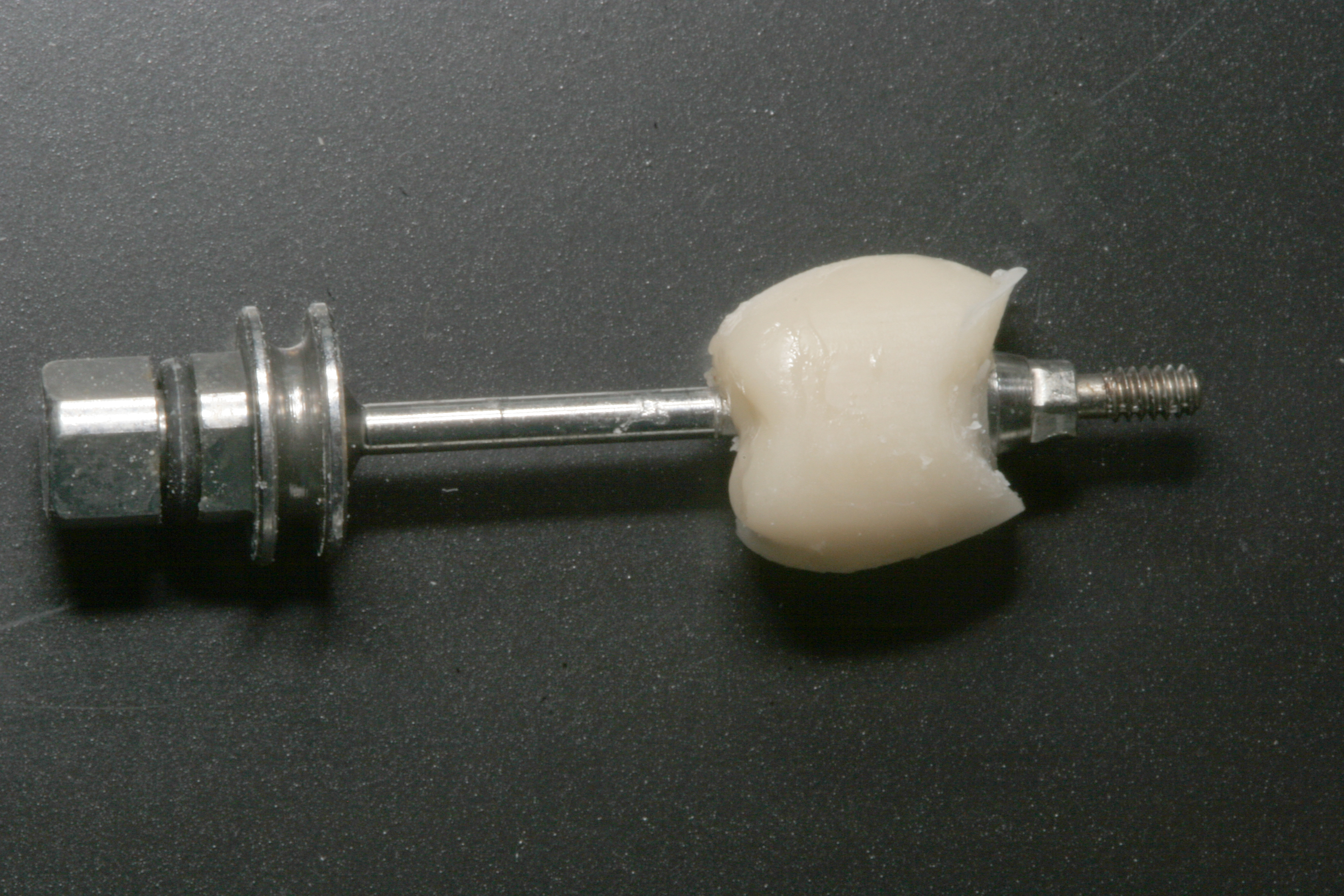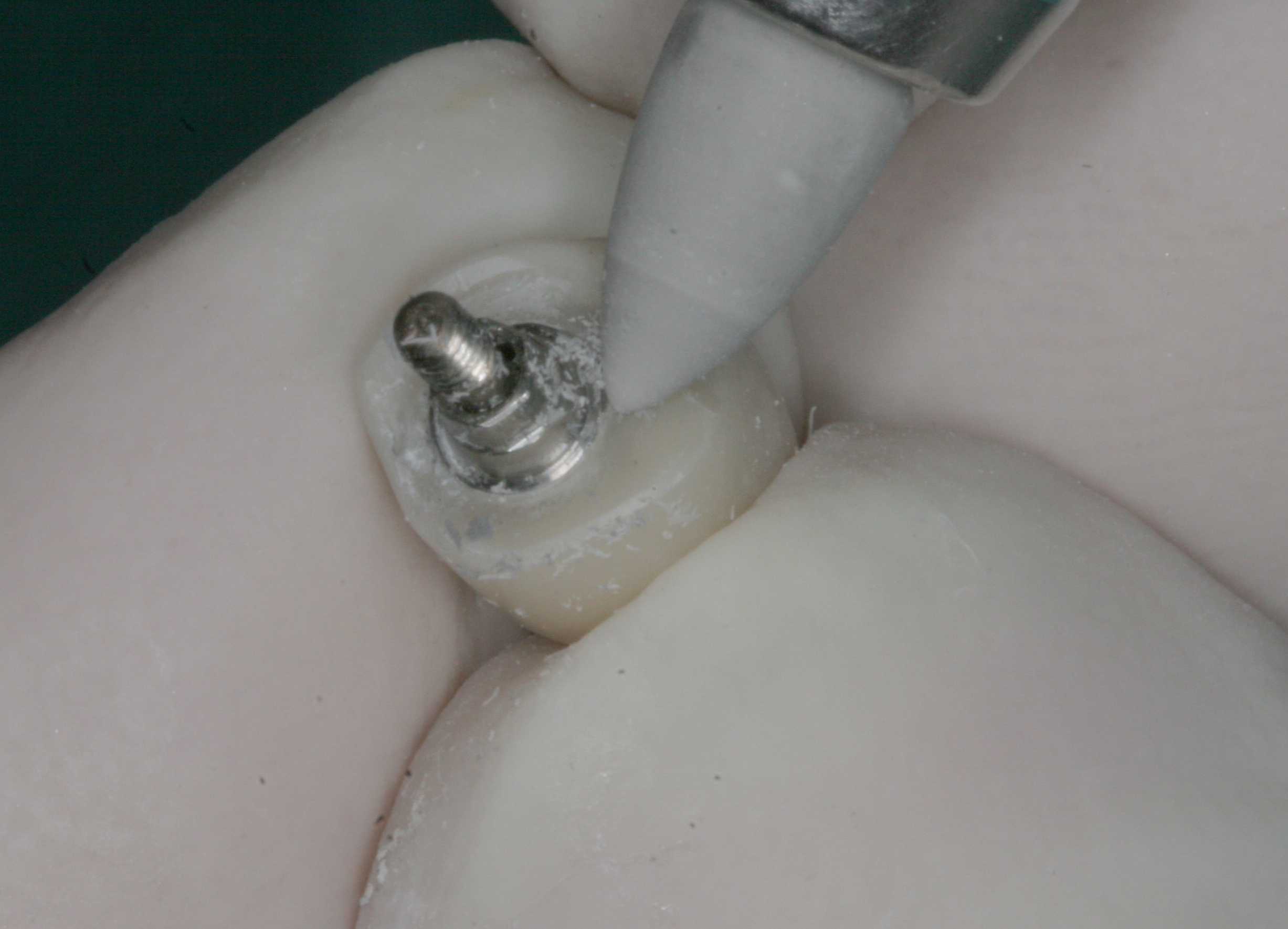 The time it takes to re-cover and remove the abutment screw—the initial set time of the chemical-cure portion of the resin dual-cure cement (in addition to the 10-second light polymerization)—provides sufficient retention to remove the crown/abutment assembly intact. If the resin cement is fully polymerized and remains in an interproximal undercut, it may be more difficult to remove.