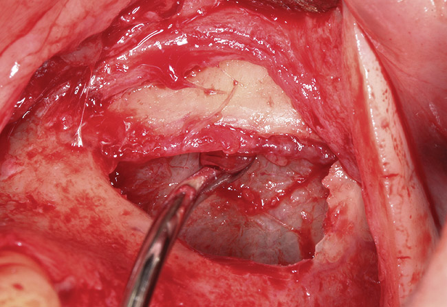 The technique described below is based on a deep buccal full-thickness flap with vertical release in the canine area, followed by creation of a “window” at the lateral wall of the sinus (Figure 2). The bony window is either removed or rotated medially with the sinus membrane and pushed inward. The Schneiderian membrane is then separated from the bone anteriorly, posteriorly, and medially until clinically sufficient space is established (Figure 3). The created space, which occupies the lower third of the sinus, is filled with a bone graft (Figure 4), and the lateral access window is covered with a collagen membrane (Figure 5).
