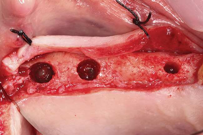 Other possible complications associated with maxillary sinus augmentation may include infra-orbital nerve injury, bruising, and soft-tissue dehiscence. The risk for post-operative infections, which occur in up to 10% of sinus floor augmentation procedures, may be reduced by the use of preoperative antibiotics.10,11 Occasionally, complications such as excessive bleeding from major blood vessels near the bone of the lateral wall or the sinus membrane (Figure 6), hematomas, wound dehiscence, and implant migration into the sinus cavity are also reported to occur.12