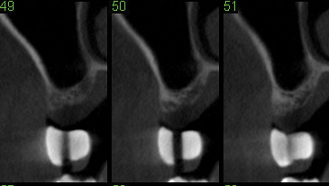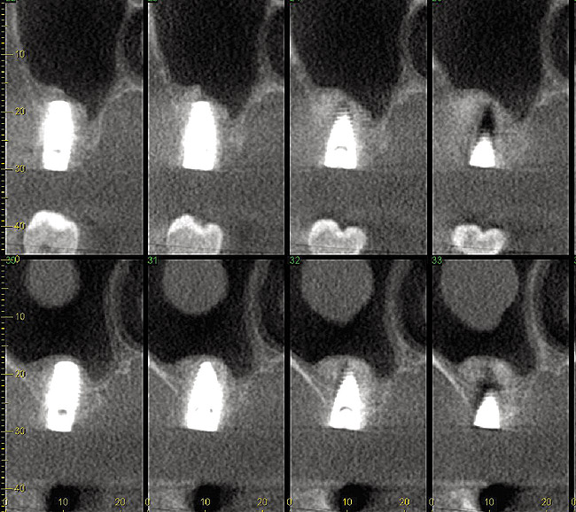 Drill depth gauge—A common complication of the crestal drill osteotomy is unintended perforation of the Schneiderian membrane. As a consequence, specific sleeves in different lengths were developed (Figure 8). These sleeves, which are placed on the drills, serve as gauge stoppers that prevent drill overextension. While the Cosci system uses only 3-mm-diameter drills, the newer systems include wider-diameter drills, which offer better visibility and control of the osteotomy and the integrity of the Schneiderian membrane. Figure 9 shows an implant insertion case using one of the newer systems to perform this crestal osteotomy technique. Osteotomy was performed with a non-cutting drill in 1-mm depth increments using depth gauge stoppers until the bone tissue is removed and the intact Schneiderian membrane is visible. The Schneiderian membrane is then elevated using bone-filling material, as described by Summers’ original technique (Figure 10). Following sufficient augmentation, the implants are inserted (Figure 11). Cone-beam computed tomography after 6 months reveals the bony mantle covering the inserted implants (Figure 12).