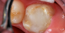One year after restoration, the patient presented with a section of the composite fractured from the distobuccal aspect of the tooth (Figure 11). That cusp was hypoplastic but not carious, and the patient complained of sensitivity to cold and inspired air. Three applications of 38% SDF solution were painted over the region, with gentle air drying after each application (Figure 12 and Figure 13). The patient reported no sensitivity immediately after treatment, and 3 months later the SDF was applied again. The patient denied having any sensitivity since the first SDF treatment.