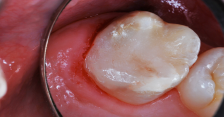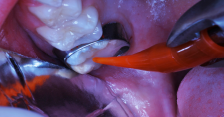 The same boy pictured in Case 1, in another dentistry office, had occlusal-lingual resin-based composite restoration of his malformed maxillary right first molar about 18 months previously. The bonded repair had been completed expertly and was holding up well. However, the boy developed a new caries lesion involving the distolingual cusp (Figure 6). After local infiltration anesthetic injection, a cotton roll was placed in the mucobuccal fold to absorb saliva from the parotid duct in the cheek.