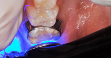 The occlusal-distolingual tooth preparation was completed, and a stainless steel orthodontic band was pressed into place to serve as a matrix (Figure 7). After two 60-second applications of a 5% glutaraldehyde/HEMA desensitizing solution, a self-etching bonding agent was painted on the enamel surfaces. An RMGI bioactive ionic resin-based composite was then injected in two portions (Figure 8), with 10-second light beam exposure between the injections. After the material was injected to overfill, the light beam was applied once more, for 20 seconds (Figure 9). The restoration was then trimmed and finished in the usual manner using large, round diamond burs at slow speed and diamond finishing burs on the axial surfaces (Figure 10). The self-etching bonding agent was then applied as a final glaze, and occlusal contacts were adjusted using articulating paper as a guide.