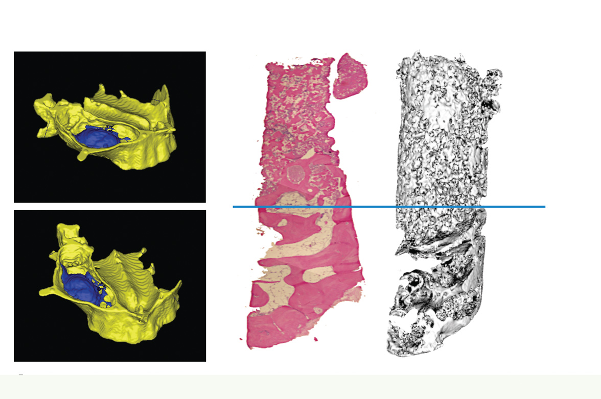 Recently, ixmyelocel-T stem cells were evaluated in a randomized, controlled clinical trial to evaluate sinus floor augmentation with transplantation of autologous cells enriched with stem cells. Ixmyelocel-T is derived from enriched CD90+ and CD14+ bone marrow-derived cell populations and carries a unique expression of markers for tissue repair and regeneration.20 Patients with maxillary sinus bone deficiencies who needed sinus lifting procedures prior to dental implant therapy were allocated to receive either stem cells delivered on a β-tricalcium phosphate scaffold or the scaffold alone. Four months after the surgery, findings from histology and cone-beam computed tomography (CBCT) analyses indicated that stem cell therapy yielded better regenerated bone quality than standard-of-care matrix alone (Figure 1 and Figure 2).20 By targeting specific signaling pathways, oral tissue regenerative outcomes may be improved through delivery of stem cells to increase bone regeneration.