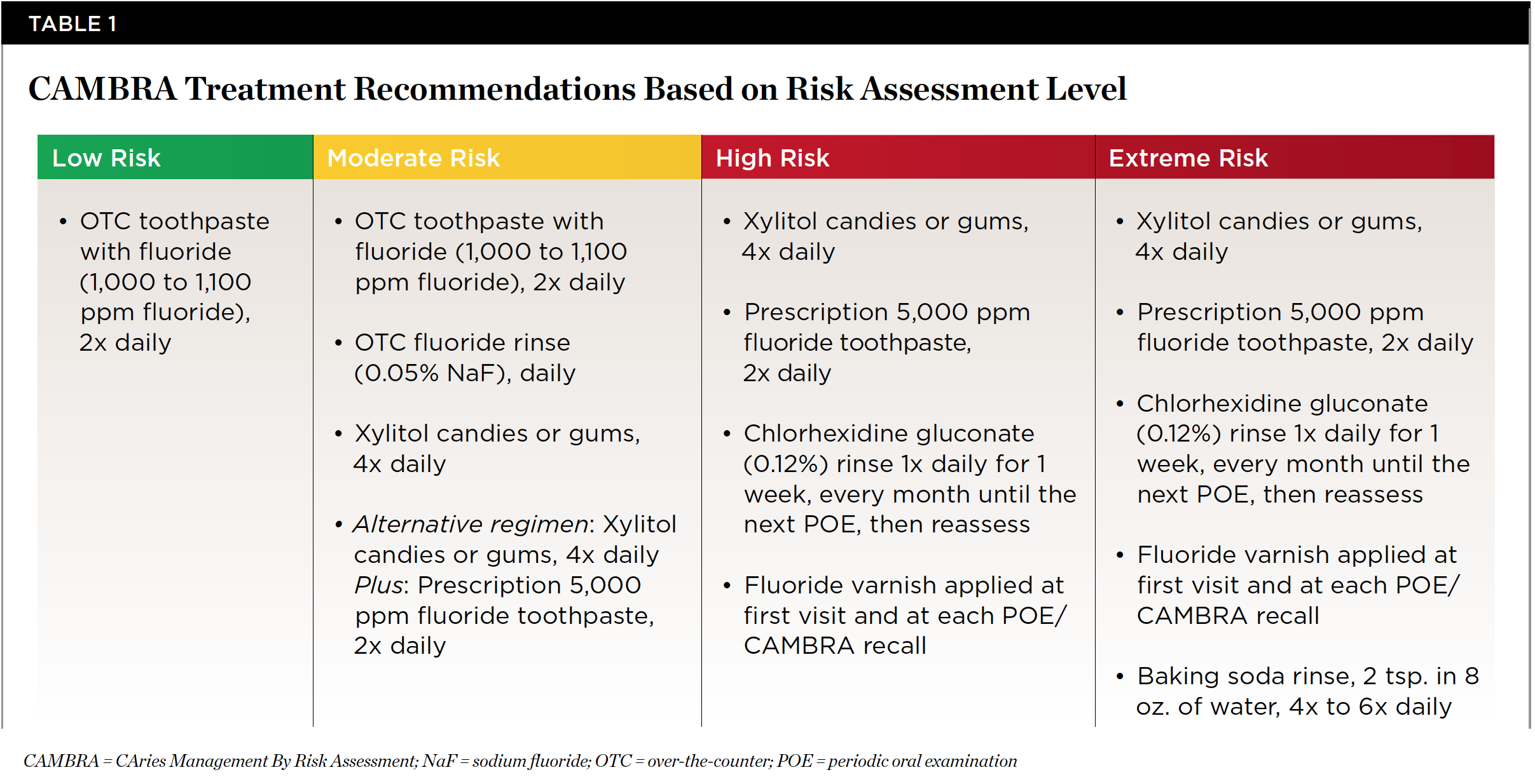 Table 1 summarizes treatment recommendations differentiated by the risk levels.11 In addition to the listed fluoride and antibacterial products, patients should receive adult prophylaxis treatment, oral hygiene instructions, and bitewing x-rays at appropriate time intervals. Visits for re-evaluation for extreme caries risk patients should occur every 3 to 6 months, and for high caries risk patients every 4 to 6 months.