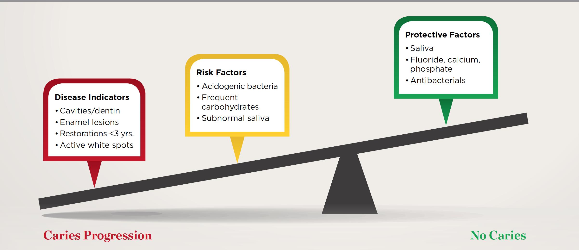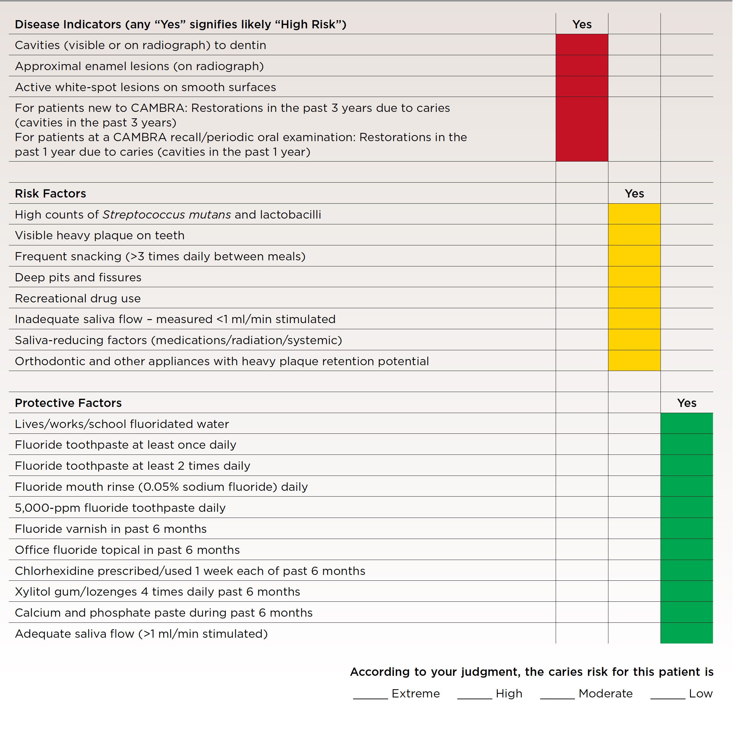 Caries risk is the likelihood of a person having new or extended tooth decay in the future. When performing an individual caries risk assessment (CRA), three categories are considered: disease indicators, risk factors, and protective factors. Figure 2 shows a typical CRA form.