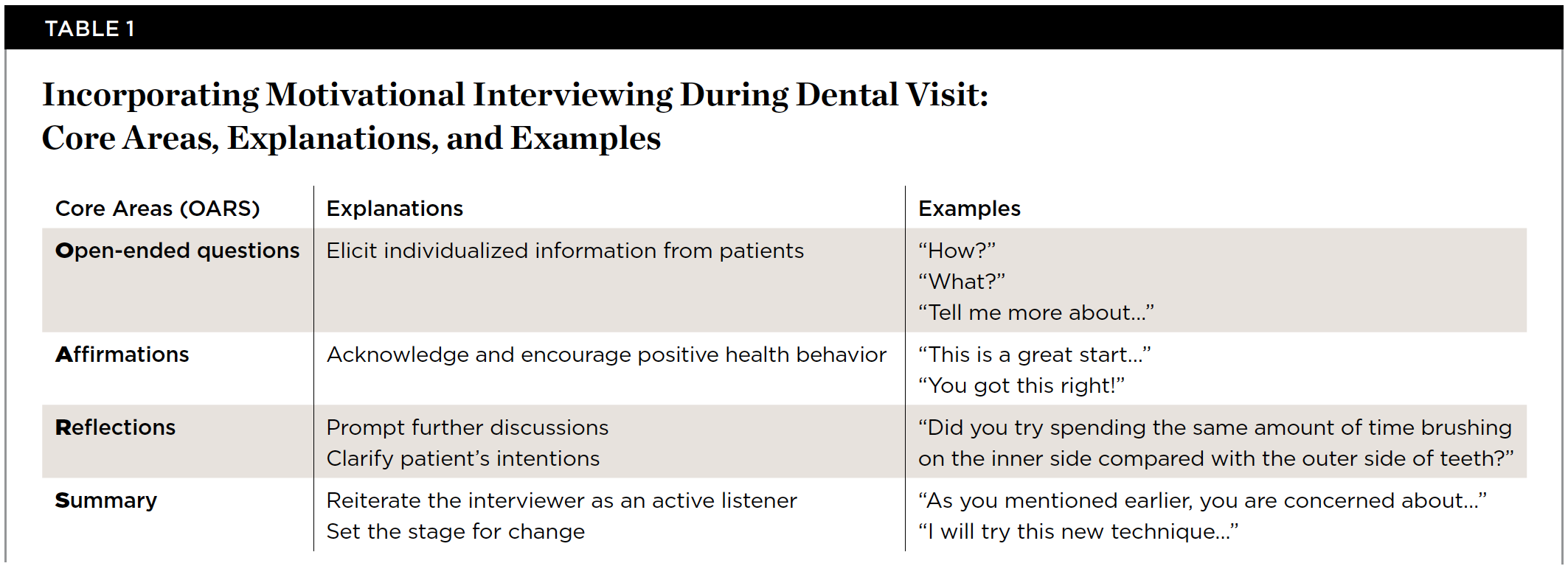 MI has become an increasingly popular psychological tool in general healthcare settings, including dentistry.18-21 MI is a person-centered, goal-directed method of communication that develops and strengthens a patient's intrinsic motivation for positive change. In MI, the key communication elements are broken down into four core areas often referred to by the acronym OARS (Table 1)22: