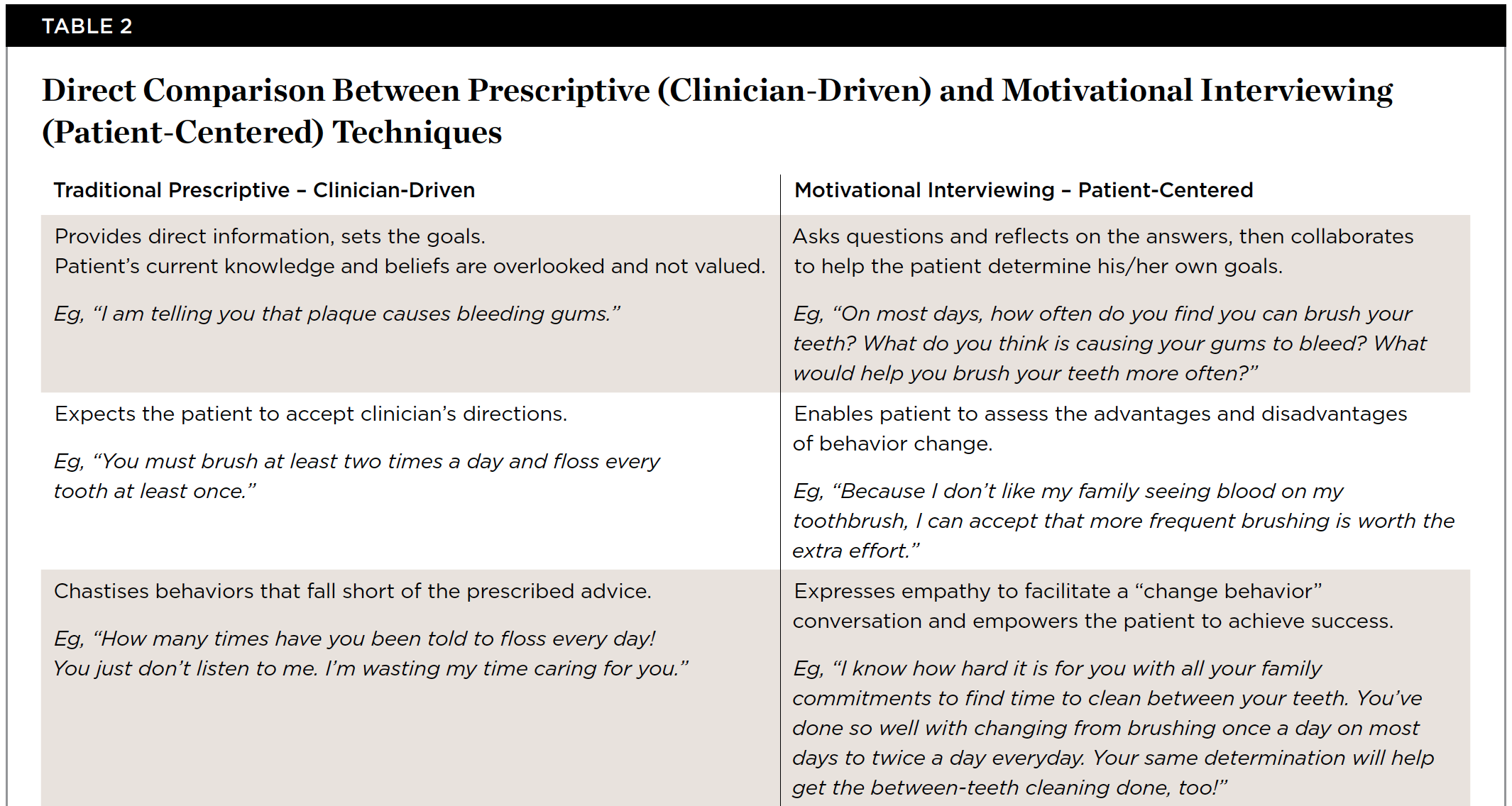 MI has been shown to be a reliable method to impact patients' health behaviors, including oral hygiene. A single session of MI has been shown to improve gingival bleeding scores and plaque indices.25,26 Furthermore, it has been demonstrated that dental professionals can be trained in MI that affects meaningful change in oral hygiene in a relatively short period of time.27 MI has been shown to impact oral health behaviors associated with reducing biofilm and improving gingival and periodontal health; however, the training and expertise of dental providers vary widely, making interpretation of results difficult.28
