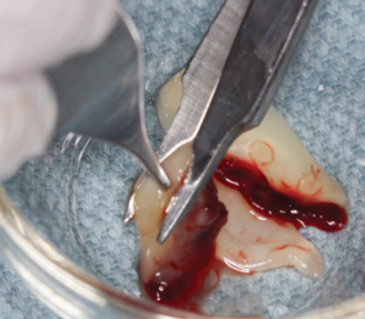 Another frequent use of PRF has been for the repair of Schneiderian membrane perforations (Figure 10 and Figure 11). While major advancements have been made with respect to surgical techniques, tools, and instruments to decrease the rate of membrane perforation, typical frequencies of tears generally have been reported in the 20% range.25,26 Traditionally, absorbable collagen membranes have been used most commonly; however, more recently attempts have been made to cover perforations with PRF. Due to the typically "sticky" consistency of PRF, this 100% natural fibrin scaffold may be used as a low-cost alternative to standard collagen membranes. Because of its natural properties, PRF, unlike a collagen barrier membrane, will not induce a foreign-body reaction.27