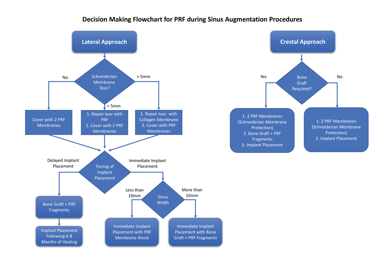 A decision-making flow chart is provided in Figure 9. If the sinus is <10 mm in width, PRF alone may be used to predictably regenerate it. When the sinus is >15 mm, PRF combined with a bone grafting material is advised. When the bucco-palatal dimension is between 10 mm and 15 mm, though it is advisable to combine PRF with a bone grafting material, the clinician's experience and the surgical protocols used may indicate the regenerative procedure. Nevertheless, future research is eminently needed to determine optimal conditions to further characterize when to use PRF alone versus in combination with a bone grafting material. Conservative, predictable protocols, as suggested in Figure 9, are always recommended.
