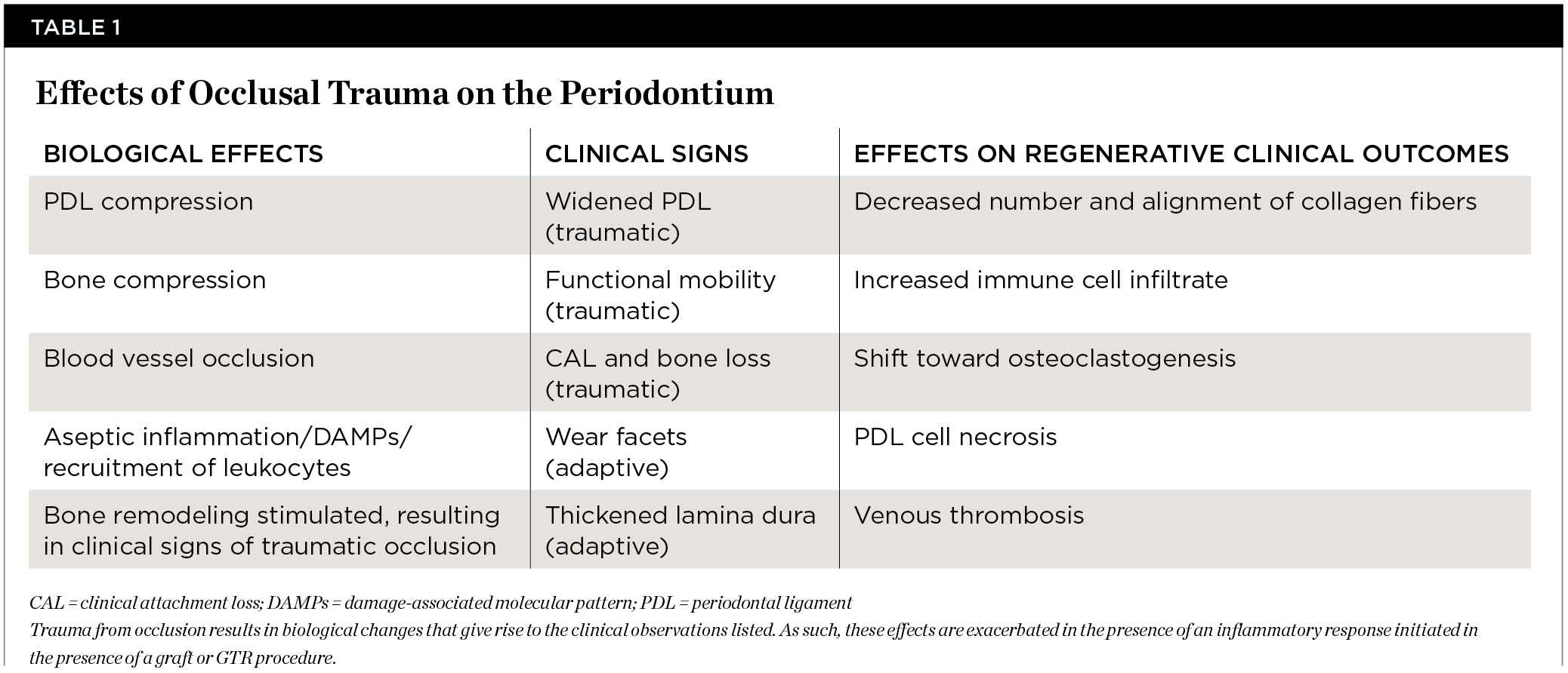 Based on the available data, the authors conclude that traumatic occlusion can stimulate a detrimental inflammatory effect, similar to chronic wounds, which can ultimately affect regeneration of local tissues. Additionally, chronic wound inflammatory conditions caused by occlusal loading can be exacerbated in the context of autoimmune disorders or chronic inflammatory conditions (eg, diabetes), and steps should be taken to alleviate trauma, especially in such cases. Lastly, all four stages of wound healing—hemostasis and inflammation, migration, proliferation, and remodeling—are essential components of the wound healing process, and prolonged existence in any of these states can be detrimental to the final regenerative outcome.
