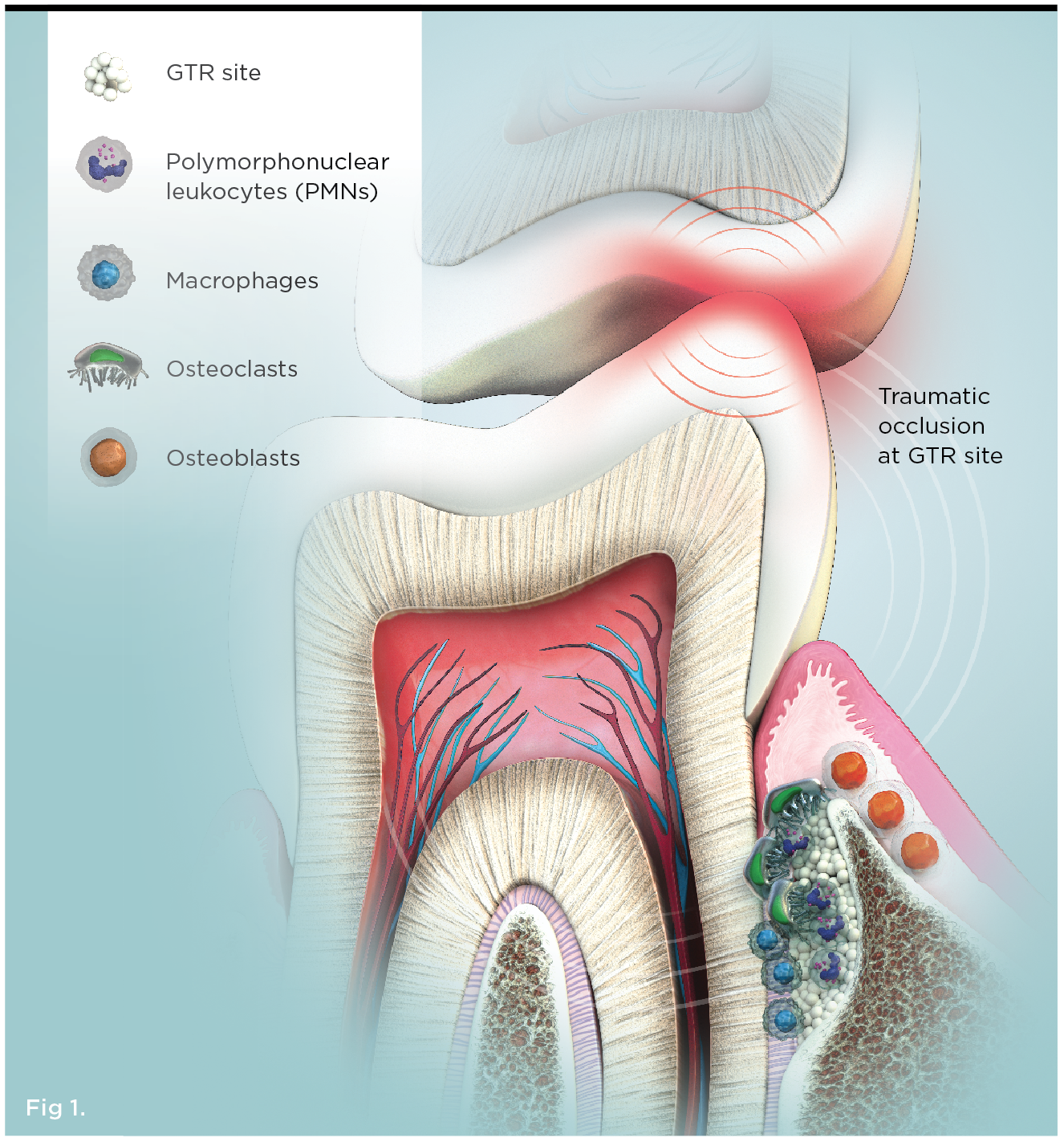 Wound healing must progress through a number of stages, including inflammatory response and resolution and final structure remodeling and maturation. Table 1 provides a summary of effects of occlusal trauma on the periodontium, including biological consequences, clinical signs, and effects on clinical outcomes. When wound healing is sought at the location of the PDL, occlusal trauma must be considered from both a biological and physiological perspective, as it can cause unwanted changes to the healing site and undesired inhibition of sustained bone growth. More specifically, traumatic occlusion can cause disorientation of PDL fibers, a decrease in the amount of collagen fiber, an increase in immune cell infiltrate, a shift in the bone remodeling balance toward osteoclastogenesis, venous thrombosis, and PDL cell necrosis, as described in the literature review above. Further, occlusion can influence PDL repair and the neurovascular supply of the pulp.28 All of these effects of occlusal trauma together are magnified in the context of a wound repair situation, such as implant placement, GTR, or in the case of subluxated teeth. Figure 1 illustrates a summary of the effects of occlusion on wound healing.