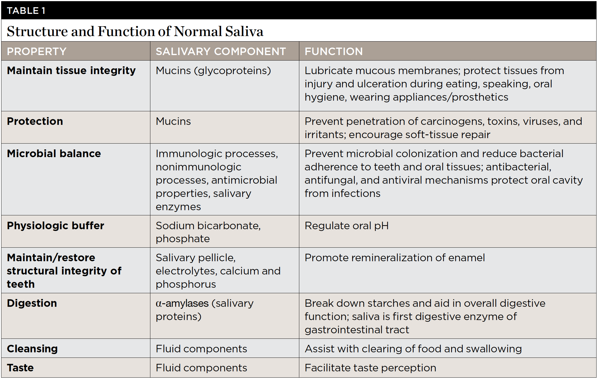 Saliva not only aids in digestion by facilitating oral processing and swallowing of food, but it also has protective functions that include cleansing the oral cavity, maintaining a neutral pH, preventing tooth demineralization, and protecting oral tissue against microbial and physical insults (Table 1). The various immune and non-immune salivary proteins that inhibit the adherence and growth of viruses and bacteria confer the antimicrobial properties of saliva,25 while the mucins and salivary proteins contribute to the lubrication and coating of oral tissues. These agents protect the oral mucosa and teeth from physical, chemical, and microbial damage. Saliva facilitates speech and taste through lubrication and moisture, and the dissolution of materials in saliva stimulates taste receptors on the tongue. Salivary gland hypofunction often results in dysgeusia (altered taste sensation) and dysphagia (difficulty swallowing).26,27