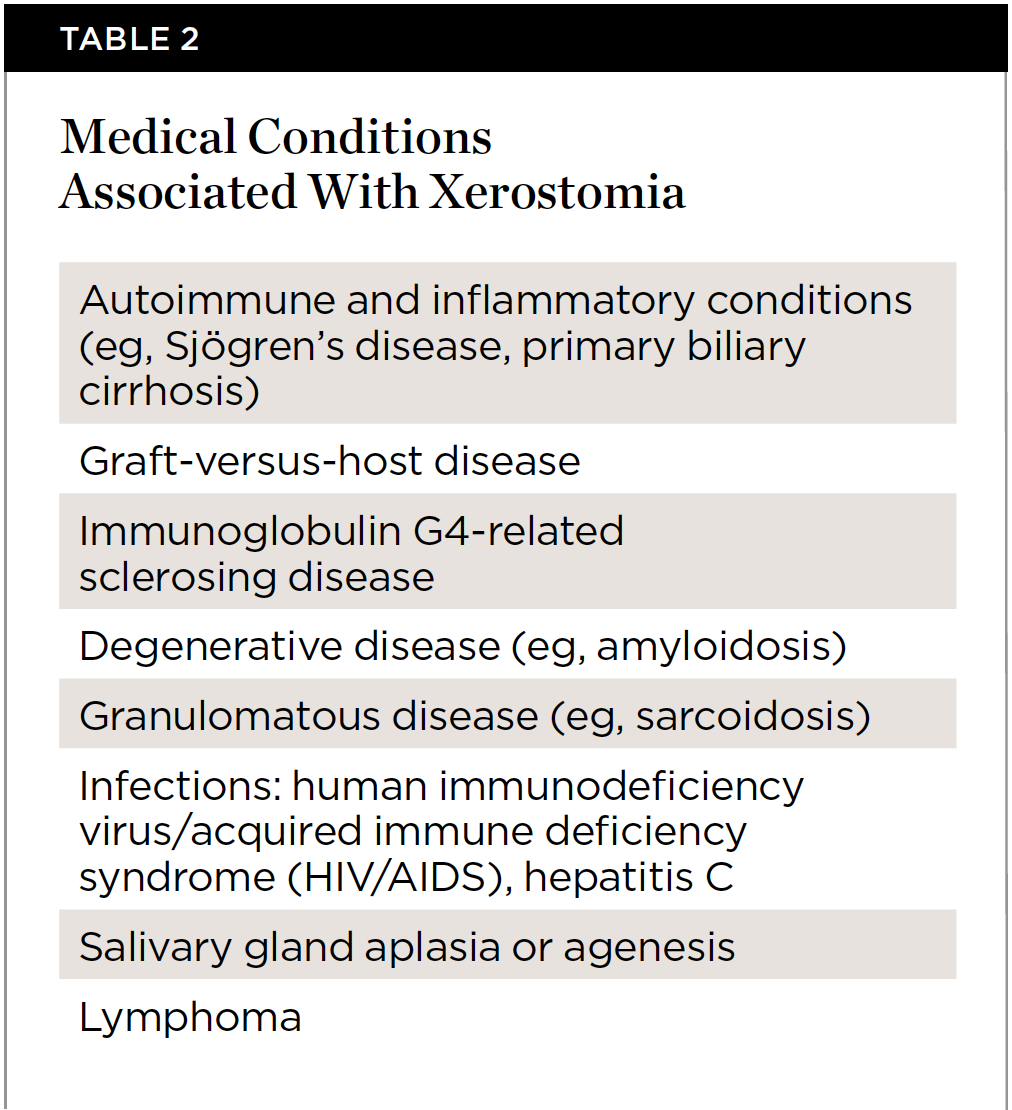 A thorough medical history is the cornerstone of a correct diagnosis and, subsequently, appropriate treatment of the underlying cause of xerostomia. The presence or history of particular diseases may put patients at risk for the development of dry mouth, or, much more commonly, xerostomia may be medication-induced (licit or illicit). Table 2 lists the most common medical conditions associated with xerostomia.18,28,29
