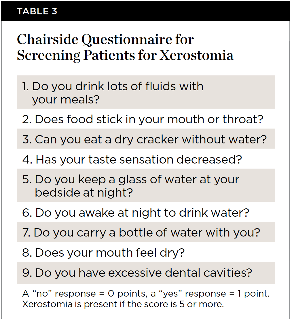 3. Plemons JM, Al-Hashimi I, Marek CL; American Dental Association Council on Scientific Affairs. Managing xerostomia and salivary gland hypofunction: executive summary of a report from the American Dental Association Council on Scientific Affairs. J Am Dent Assoc. 2014;145(8):867-873.