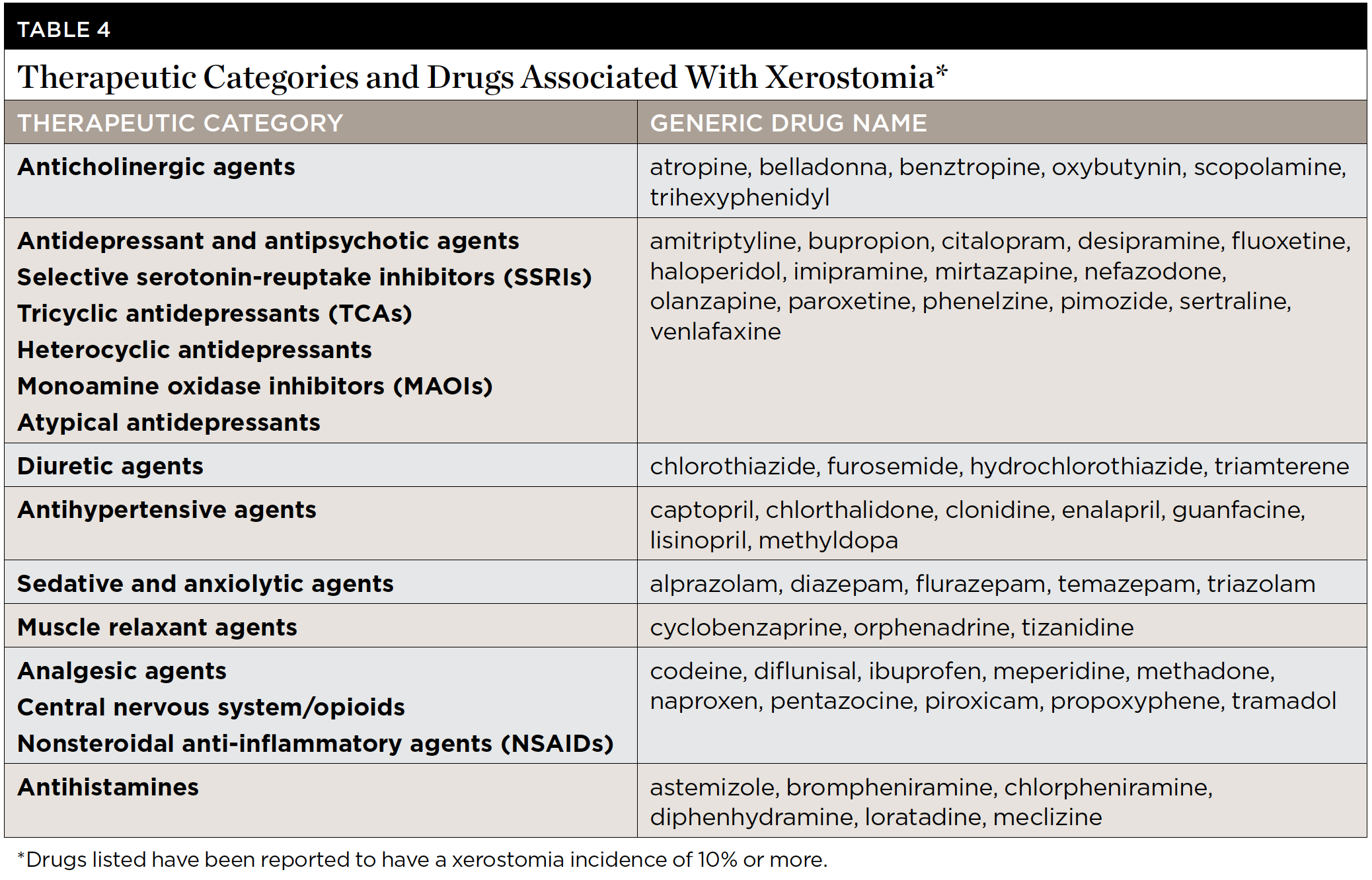 Systemic medication use is one of the most frequently reported causes of hyposalivation and xerostomia.4,28,42,43 More than 500 drugs are known to cause dry mouth, including many of the most common over-the-counter (OTC) and prescribed classes of medications (Table 4).3,27Unfortunately, this effect is not just limited to licit medications, as many illicit drugs produce this consequence as well.44-49 Patients receiving multiple xerostomic medications tend to have more severe dry mouth symptoms, and patients with salivary gland hypofunction are more susceptible to the xerogenic side effects of medications than patients with normal salivary gland function.6-9