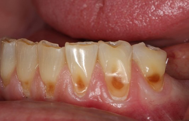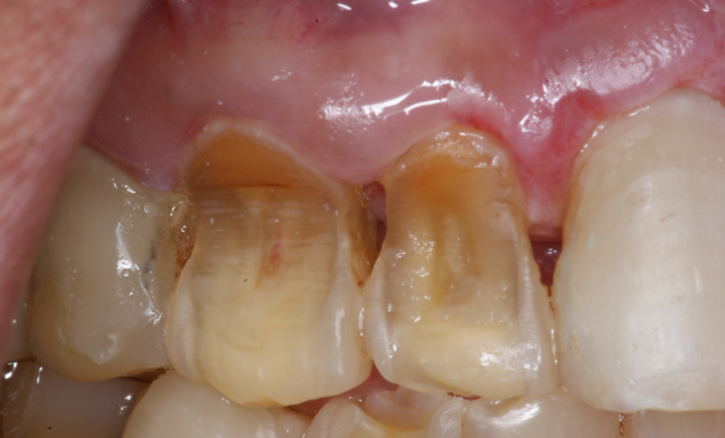 Due to the irreversible nature of dental erosion, cases may present in which the state of the tooth is such that excessive dentin has been exposed or the pulp has been severely compromised. In extreme cases, dental erosion can indirectly cause restoration failure by compromising the tooth/restoration interface or by weakening the surrounding tooth structure leading to restoration fracture. In Figure 13, the defective amalgam restoration demonstrates how the surrounding enamel is worn, leaving dentin exposed. Exposed dentin is at greater risk of erosion and demineralization if left untreated. These surfaces will then be susceptible to bacterial attack and recurrent caries. Proper management of erosive lesions can save the tooth from future caries risk.
