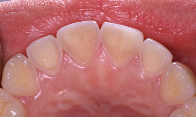 In offering preventive instructions to the patient, the health practitioner, be it a physician, dentist, or even dental hygienist, must identify the causal factors of erosive tooth wear, which should be followed by instruction in modifying or avoiding these factors. To address dietary causes, ideally abstinence from acidic foods and drinks would be recommended for prevention of dental erosion. However, if the patient cannot comply, modifying such eating and drinking habits might also suffice. Modifications to reduce the frequency of intake and contact time of acids may slow the progression of dental erosion considerably. The duration of acid contact to the dentition can be decreased through controlled intake whereby patients do not hold or swish acidic beverages in the mouth and avoid slow ingestion of such drinks. Figure 12 is an example of the clinical erosion of enamel of a patient who often sipped and held soda drinks in his mouth in high frequencies throughout the day. This habit promoted loss of enamel and dentin in the facial and incisal surfaces of the patient's upper incisors. He was made aware of how this habit contributed to the tooth pathology and was educated on dietary and habit changes in an effort to reduce tooth destruction.