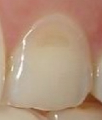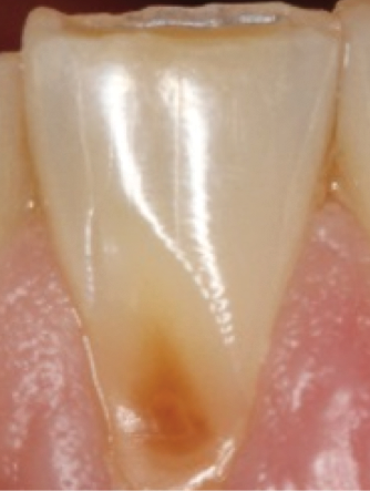 In the early stages of dental erosion, obtaining a diagnosis can be difficult, because few or no signs may be detected. Initial indications of enamel erosive lesions are a smooth, shiny surface with the absence of perikymata and lobi, but the color remains unaltered.8,21,28 Once the condition advances, the morphology changes with the loss of enamel, and color changes may manifest with the tooth appearing increasingly yellow due to the thinning of enamel and shine-through of dentin.