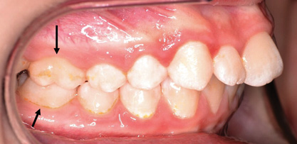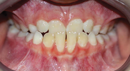 A third abnormality in dental development is crowding. Early intervention for severe crowding, ie, involving teeth that are >10 mm in mesial-distal width, may be necessary. Common causes of crowding include teeth that are large, eg, central incisors that are >10 mm wide, the presence of an arch circumference length and tooth size discrepancy, and early loss of primary teeth without space maintenance.16,17 Treatment options include serial extraction of primary teeth and possibly permanent premolars, which may especially be indicated in cases where a patient has particularly large teeth.18 Expansion is another option to balance out the arch length and tooth size discrepancy.