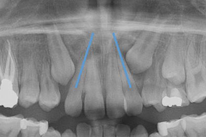 Fig 4. Impacted canine, radiographic signs. Lateral incisor crown distal flaring is apparent.