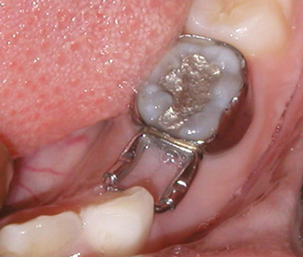 In cases of premature loss of primary teeth or missing permanent teeth, space maintenance is crucial.42 Possible causes of such tooth loss include caries, trauma, or a congenital disorder. If proper spacing is not maintained, mesial tooth drift may occur,43,44 which can lead to impaction or ectopic eruption of permanent teeth, as previously discussed. Various designs of space maintainers are available, depending on the location in the mouth that needs space preservation. Common devices include the Nance arch for the maxilla (Figure 15), a lower lingual holding arch for the mandible (Figure 16), and a band and loop or distal shoe for unilateral cases of space loss (Figure 17). Band and loop appliances seem to have the highest longevity intraorally; generally, unilateral devices fare better than their bilateral counterparts.45