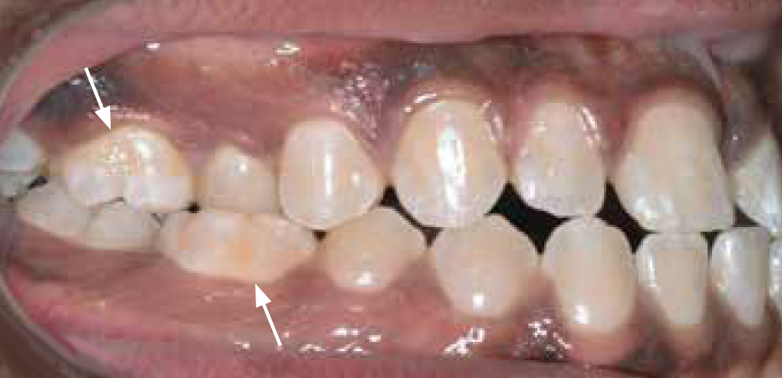 A common developmental abnormality is a localized anterior crossbite on permanent incisors, which may lead to trauma to these teeth. The most common cause of localized incisor crossbite is an anterior occlusal interference, which causes a functional shift when the patient moves from centric relation to centric occlusion (Figure 1 and Figure 2). This is not a true class III malocclusion, and proper diagnosis is critical to select the correct treatment. Sometimes this bite relationship is called a pseudo-class III relationship.2 Intervention in these cases is important because these teeth are at higher risk for recession, periodontal damage, and incisal chipping. Limited anterior braces and sometimes a palatal expander may be used to place the maxillary incisors facial to the mandibular incisors; this is referred to as "jumping the bite."