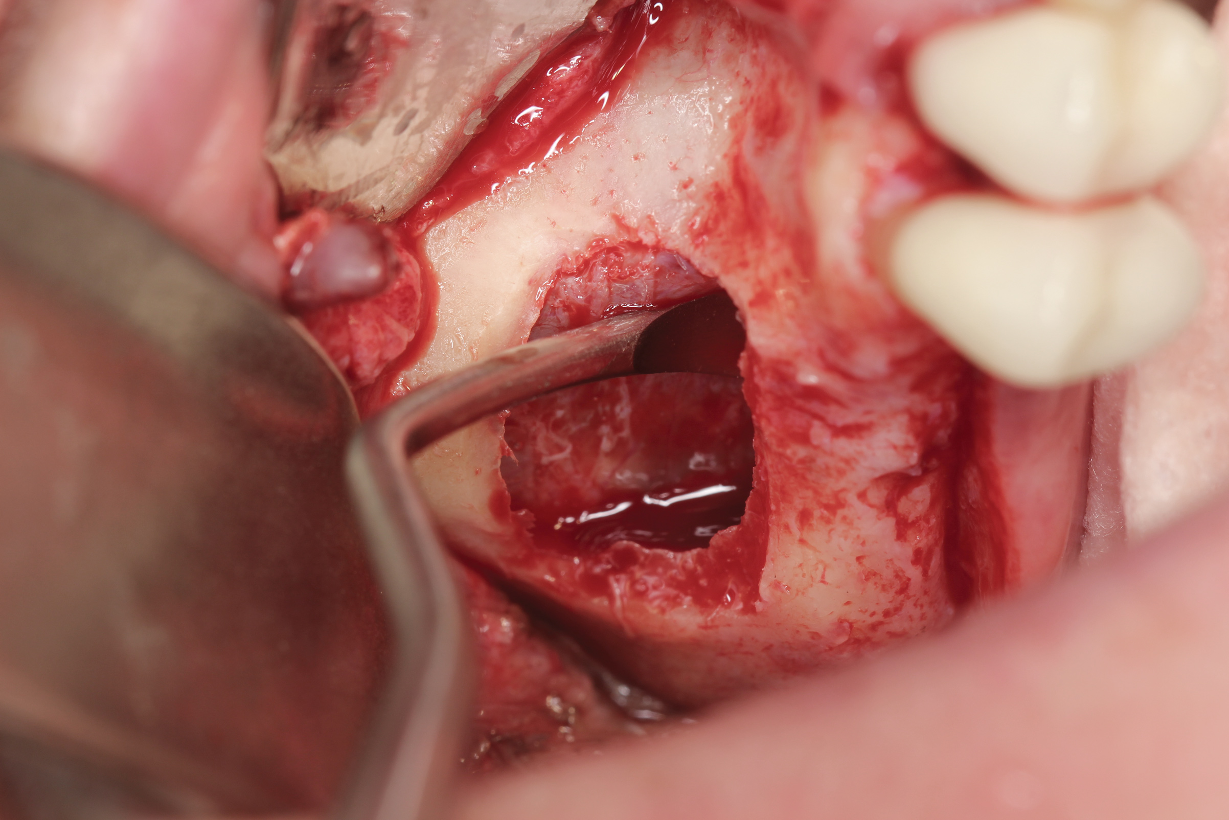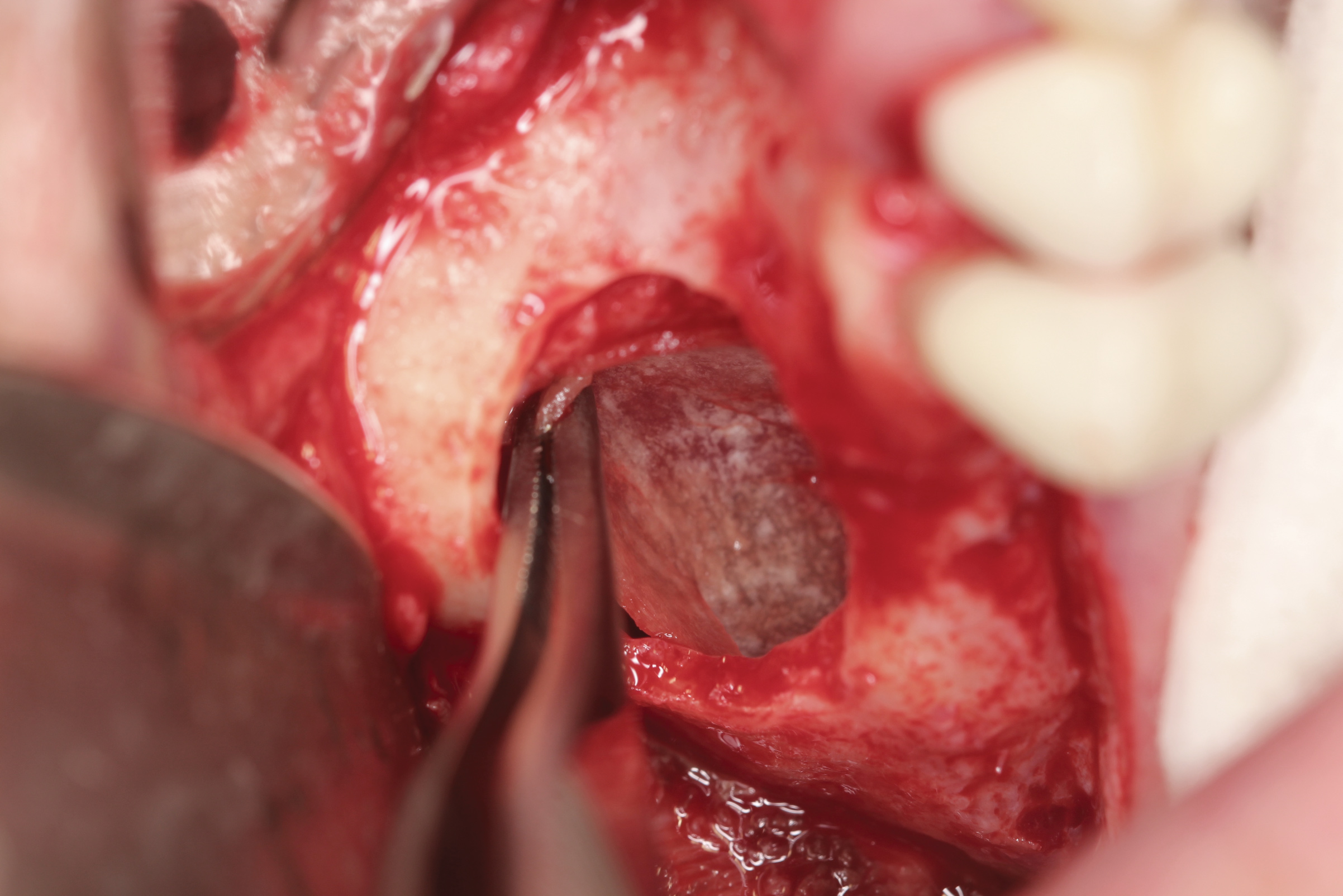 A lateral sinus window was created using a combination of a round fissure bur and piezosurgery device tip (Figure 3). The elevation of the Schneiderian membrane was also performed with a piezosurgery device along with hand instruments (Figure 4). A type 1 bovine cross-linked collagen membrane (Mem-Lok®, BioHorizons, biohorizons.com) soaked in liquid platelet-rich fibrin (PRF) was placed over the Schneiderian membrane along with two PRF membranes prior to the use of OD burs (Figure 5). The OD burs were then utilized to densify bone on the osteotomy walls (Figure 6). The bone graft, composed of a 50/50 mixture of cortico-cancellous allograft and xenograft mixed with PRF fragments, was used to fill the bone defect in the sinus, followed by implant placement (Figure 7). Primary implant stability was measured at 60 Ncm. Lastly, a collagen membrane was placed over the lateral window with fixation and covered by two PRF membranes to enhance soft-tissue healing (Figure 8). Primary closure was obtained using 3.0 polytetrafluoroethylene (PTFE) sutures (Figure 9).