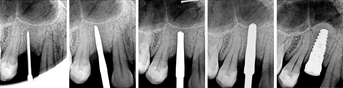 Figure 10 shows a missing maxillary left first bicuspid tooth. An envelope incision with full flap reflection was used to reveal division A ridge width.6 OD burs were then used to create an implant osteotomy (Figure 11). As per protocol, appropriate osteotomy diameter was created with the successive use of OD burs followed by the application of a bone grafting putty (NovaBone®, NovaBone Products, LLC, novabone.com) via the crestal osteotomy. The bone putty was introduced to the site (Figure 12), and OD burs were used to propel the graft apically beneath the sinus membrane (Figure 13). Implant placement was performed and the flaps were sutured closed with 3.0 PTFE sutures (Figure 14). The additional bone graft at the apical portion of the implant site after implant placement was demonstrated through a series of intraoperative x-rays (Figure 15).