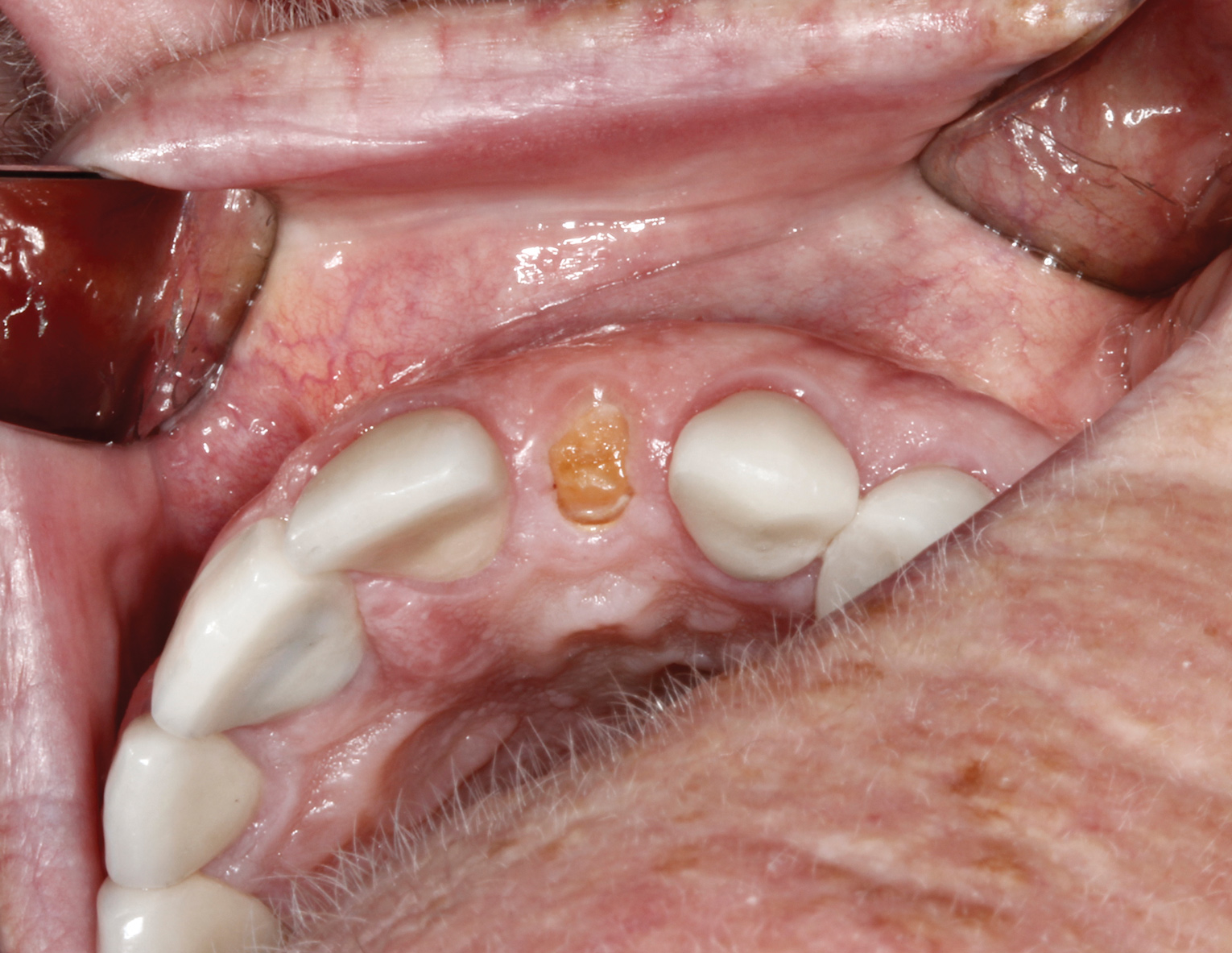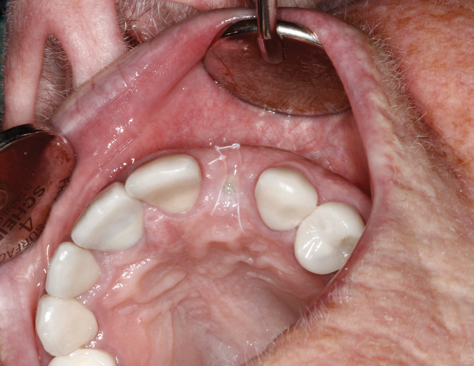 Healing of the site was observed on several occasions post-surgery, including at 4.5 months (Figure 18). Excellent gingival and underlying bone contours were revealed in 24-month photographs and panoramic x-ray (Figure 19 through Figure 21).