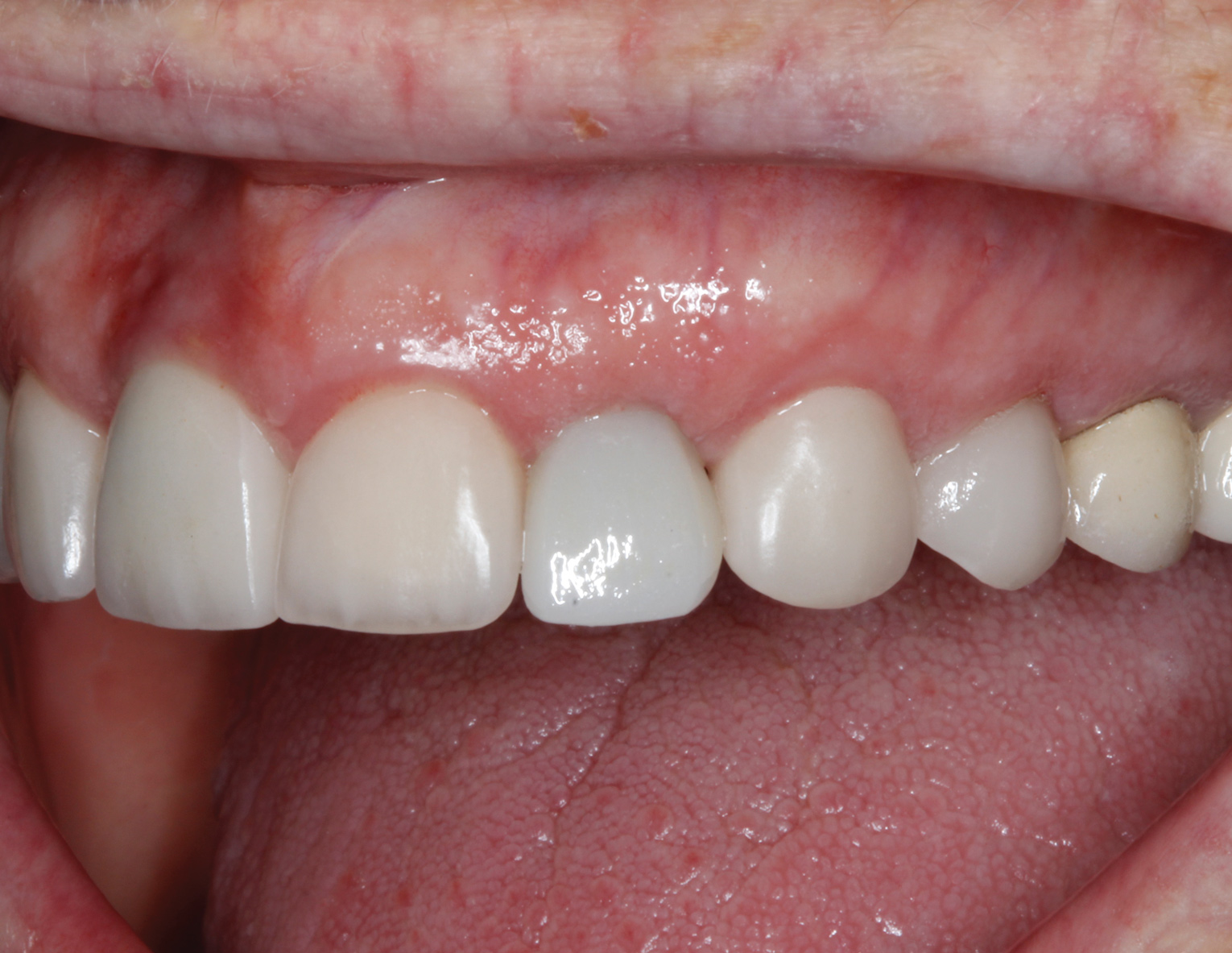 Healing and tissue contours were observed after 10 days (Figure 7) and at subsequent follow-up appointments. Photographs and a radiograph of the restoration at 14 months postoperative demonstrate the successful treatment outcome (Figure 8 through Figure 10).