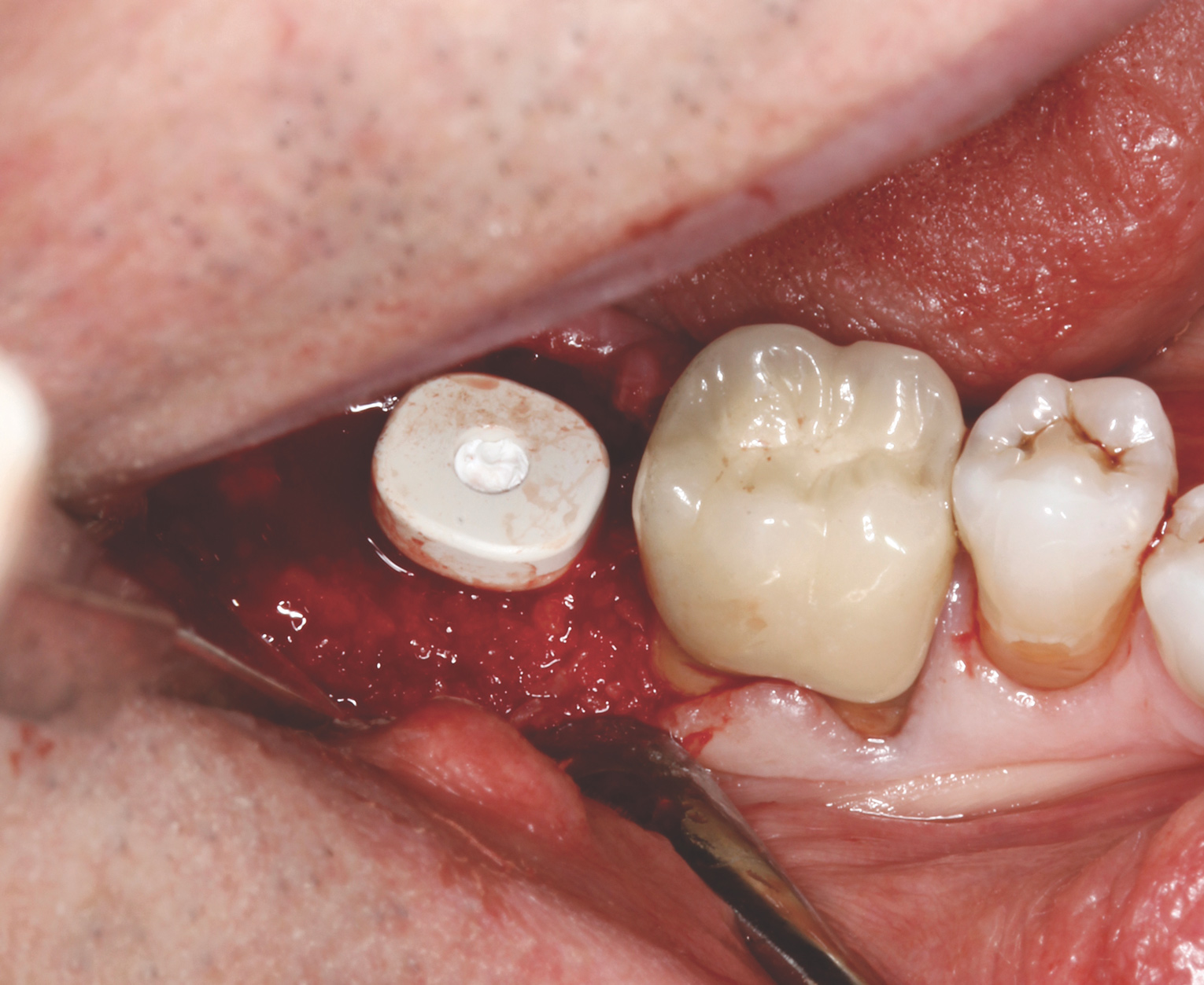 Implant insertion (5.5 mm x 13 mm NobelActive®, Nobel Biocare, nobelbiocare.com) gave excellent primary stability, was level with the residual buccal bone, and achieved an ISQ reading of 74 (Figure 14). Lingual bone contouring (to avoid abutment impingement) was followed with implant gap grafting, which included the mesiobuccal root defect and adjacent extraction site, using mineralized particulate cortico-cancellous allograft (enCore®, Osteogenics Biomedical). A 7 mm x 8 mm poly-ether-ether-ketone (PEEK) healing abutment was inserted and the access opening filled with PTFE tape (Figure 15). A single layer of dHACM (Figure 16) was inserted on the bone graft with tissue forceps and saturated with saline to seal the implant-soft-tissue interface. Suturing with 4-0 chromic gut secured the site, using inverse "figure 8" at the anterior and interrupted sutures at the posterior margin (Figure 17).