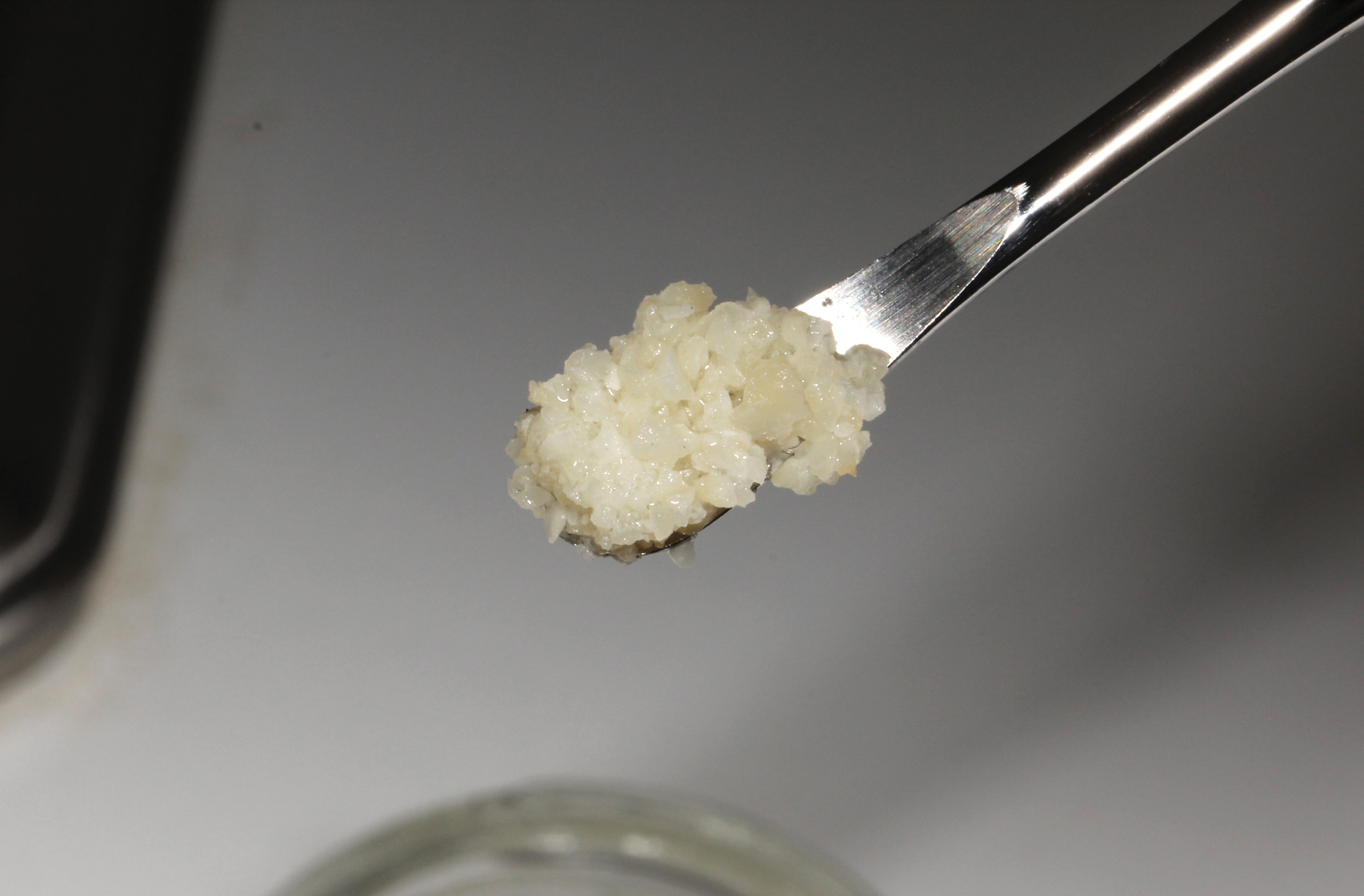 The extracted tooth fragments were cleaned to remove caries if present as well as periodontal ligament (PDL) remnants (Figure 4). The tooth was ground into particles using the dentin grinder machine. The particles were then saturated for 10 minutes in a dentin cleanser solution (sodium hydroxide solution mixed in 20% ethanol); this was followed by a phosphate buffered saline wash, resulting in a bacteria-free, autogenous graft material ready for implantation (Figure 5).
