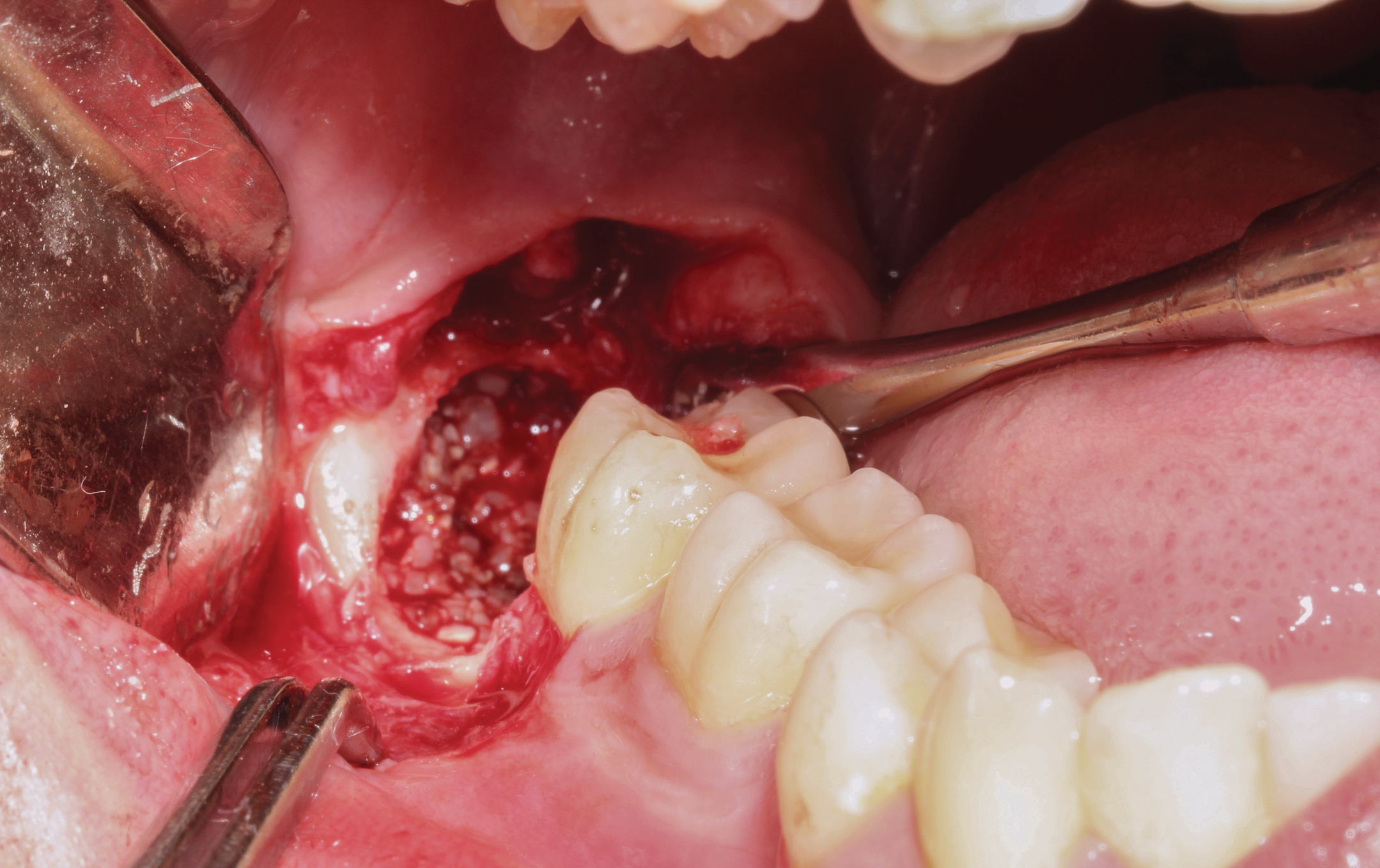 Surgical extraction of impacted mandibular third molars causes trauma, with the level of necessary bone removal dependent on the tooth's position and angulation as well as the anatomy of the patient. The extraction may lead to distal root surface resorption of the second molar and residual osseous defects.1,2 Surgical treatment of impacted third molars often requires use of a full-thickness mucoperiosteal flap, bone removal by means of osteotomy to access the impacted tooth, and sectioning of the tooth to allow removal. It has been shown, however, that surgical removal of impacted mandibular third molars may result in intrabony defects (IBDs) at the distal aspect of the second molar.3-8 These complications might be greater in older patients due to reduced bone volume, slow healing, or other diseases present such as periodontitis or osteoporosis.9