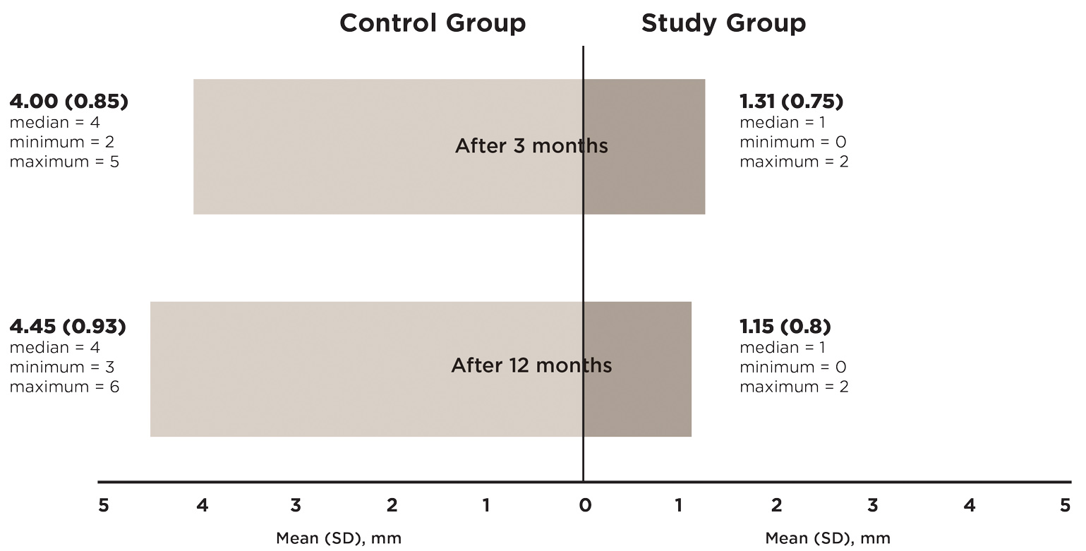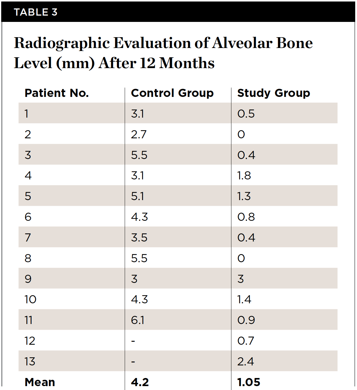 Radiographic interpretation of alveolar bone levels after 12 months showed significantly lower alveolar bone level in the study group (P < .001) than in the control group (Table 3). Mean of alveolar bone level in the control group (N = 11) was 4.2 mm (SD 1.2 mm), and in the study group (N = 13) it was 1.05 mm (SD 0.91 mm).