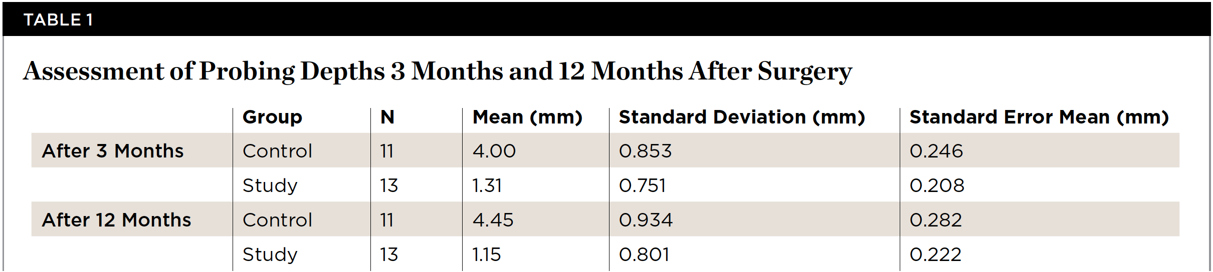 At 3 months post IMMT surgery the study group demonstrated probing depths of 1.31 mm (standard deviation [SD] 0.751 mm), whereas the control group showed probing depths of 4 mm (SD 0.853 mm). At 12 months, the study group demonstrated probing depths of 1.15 mm (SD 0.801 mm), while the control group demonstrated probing depths of 4.45 mm (SD 0.934 mm).