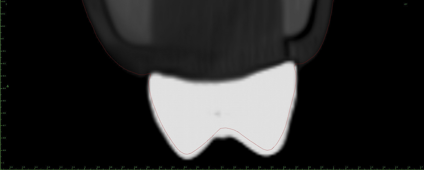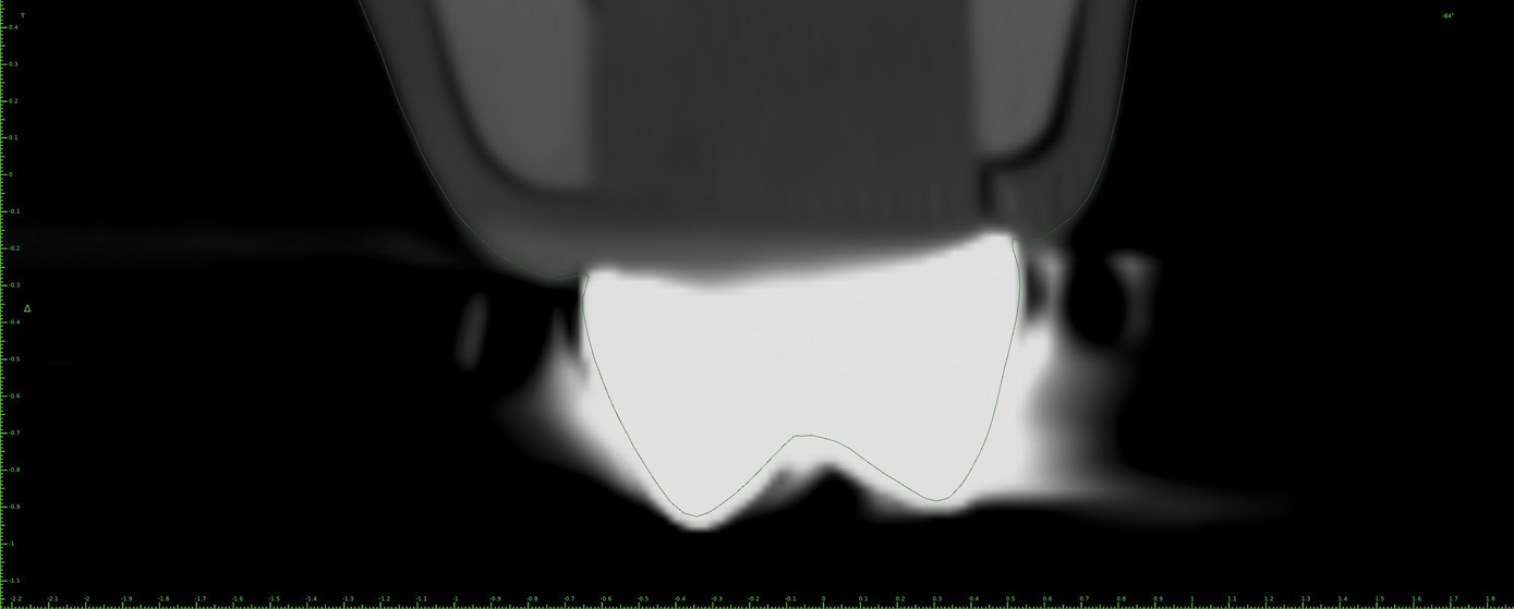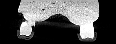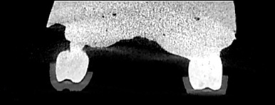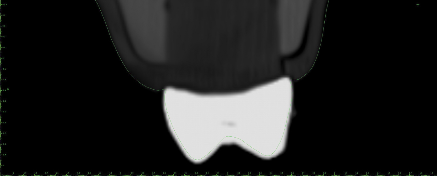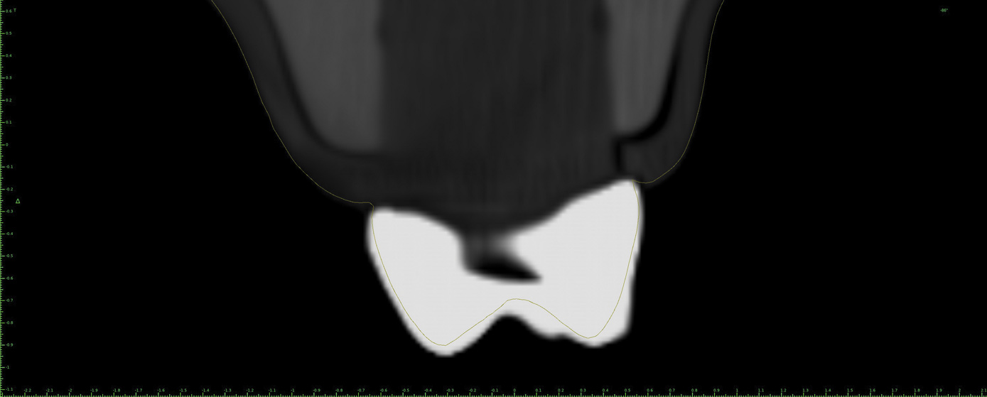 A similar concern relates to artifacts resulting from metal objects. These artifacts present as shadows and streaks around and between objects of high density, effectively deteriorating the overall shape of the crowns of the teeth in the scan. Any kind of metal prosthesis can deteriorate the scan and render the eventual registration unsuccessful. Although many CBCT manufacturers incorporate metal artifact reduction algorithms, their usefulness remains untested in the realm of implant dentistry, and the improvement they offer in the diagnostic effectiveness of the scan is questionable (Figure 7 through Figure 11).13 Positioning the patient with teeth separated and on a horizontal occlusal plane may reduce the number of artifacts originating from the opposite jaw.14