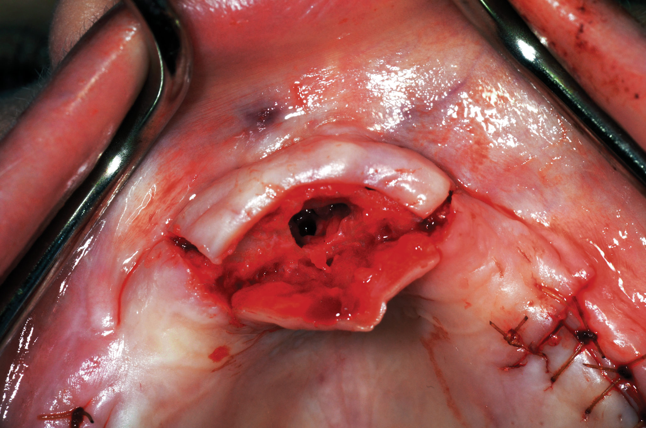 Nasopalatine canal: When the palatal tissue needs to be reflected over the nasopalatine canal to facilitate bone grafting in preparation for a dental implant, the contents of the canal, including the nasopalatine artery, should be enucleated (Figure 4).25,26 As the tissue is removed, there is often a hemorrhagic response. The procedure to control bleeding is similar to management of a hemorrhaging extraction socket.