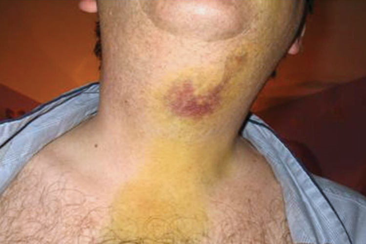 Ecchymosis and color changes of tissues: As the effect of epinephrine wears off after dental surgery, vasodilation of blood vessels ensues. If postoperative bleeding occurs, blood can advance along fascial planes and cause an ecchymosis whose pattern can vary. Tissue discoloration may appear adjacent to a surgical site or, due to gravity, extend down as far as the pectoral muscles (Figure 8). The chronology of color change related to hemoglobin breakdown is predictable: initially the ecchymosis appears reddish, in several hours it can become black and blue, by day 6 its color changes to green (hemoglobin converted to biliverdin), and by day 8 to 9 it may be yellowish-brown (bilirubin present). In general, the body resorbs hemoglobin and hemoglobin by-products in 2 to 3 weeks.37 The finding of an ecchymosis does not typically require therapy, and verbal and written postoperative instruction should inform the patient that these sequelae are not necessarily a problem.