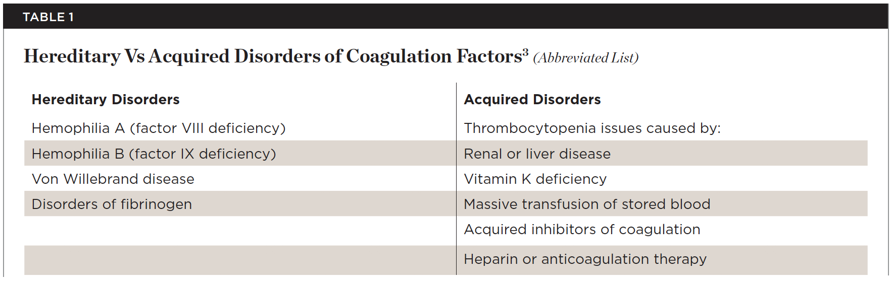A physical examination before oral surgery should be conducted. The neck, skin, and mucosal surfaces should be inspected for abnormal findings associated with hepatomegaly, splenomegaly, etc.1 Hepatic insufficiency can manifest signs of jaundice or telangiectasias. Individuals with splenomegaly can have yellowing of the skin and whites of the eyes. It is prudent to take a patient history specifically related to bleeding issues. Most abnormal conditions of vessels and platelets are acquired (eg, thrombocytopenia), while serious coagulation disorders are hereditary (Table 1).3 A history of surgery that did not cause abnormal bleeding is a reasonable sign that there are no hereditary coagulation disorders.