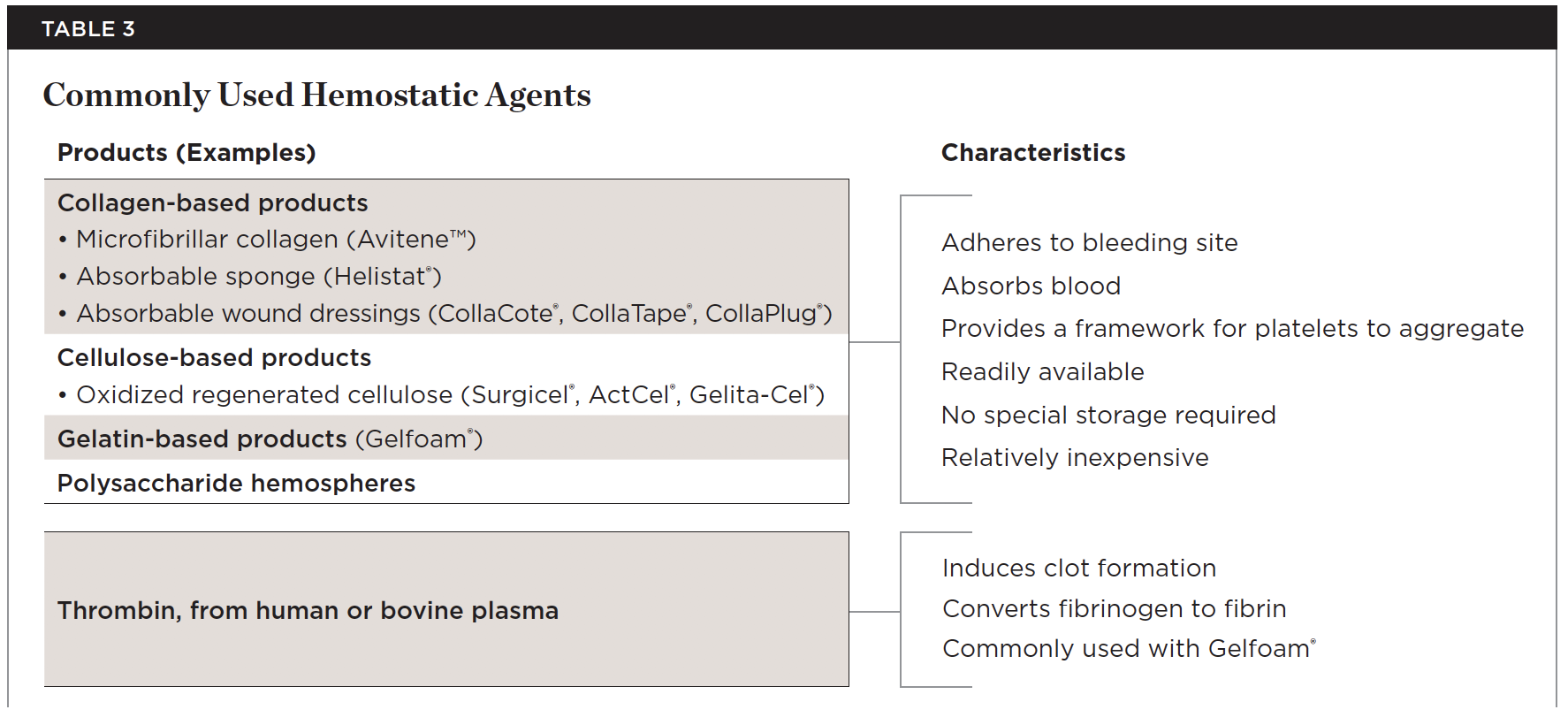 An important factor in the cessation of bleeding is time (bleeding time is 1 to 9 minutes).22 Other commonly used antihemorrhagic agents can be applied to a bleeding site; these include but are not limited to Surgicel®, Gelfoam®, thrombin, and Avitene™ (Table 3).2,19,23