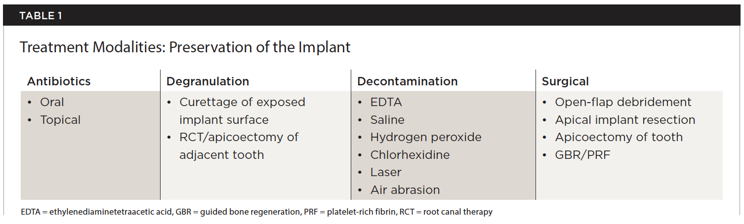 The correct diagnosis of apical peri-implant lesions in their early stages allows for early treatment and can prevent implant failure.10,21 However, treatment of periapical peri-implantitis is still only empirical. The author's search of the literature led to predominantly case reports of possible treatment options. To the best of the author's knowledge, to date no consensus has been published for treatment of RPI. Clinicians often are confounded by its clinical and radiographic presentation and treat it on the basis of empirical data. Nonsurgical and surgical treatment strategies with preservation of the implant (Table 1) as well as surgical treatment with removal of the implant (Table 2) have been reported in the literature and can be applied.
